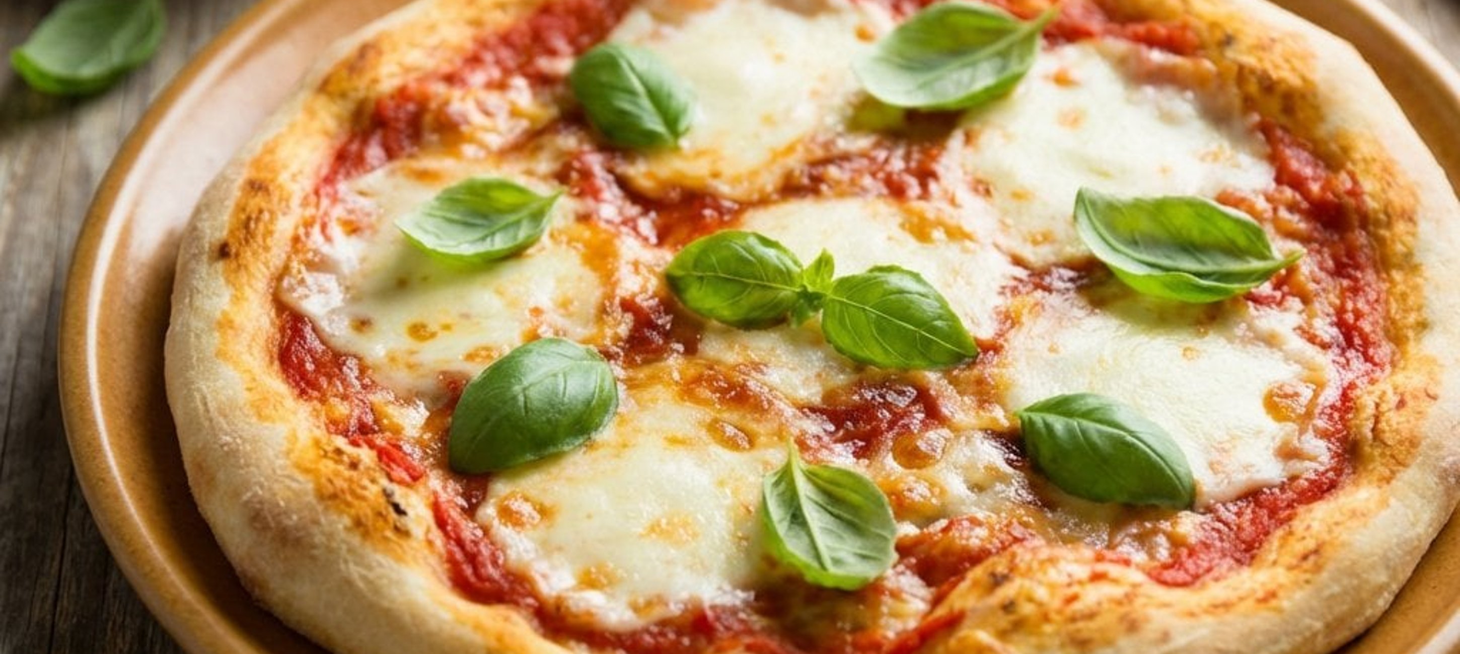 - 5Die fertige Pizza aus dem Ofen nehmen und mit den frischen Basilikumblättern garnieren. Sofort servieren.