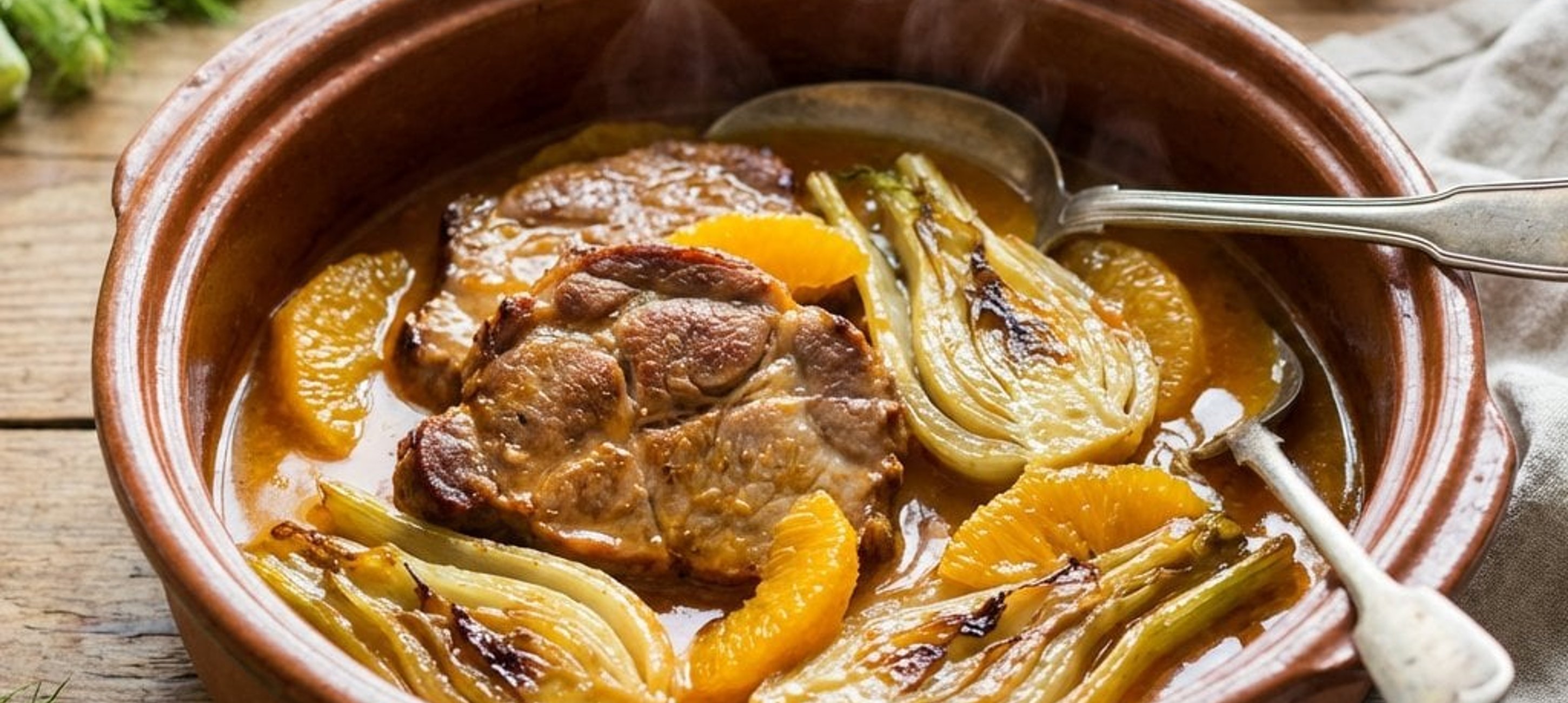 - 4In einer Pfanne bei hoher Hitze das Öl erhitzen und das Fleisch darin von allen Seiten goldbraun anbraten. Danach in einen Bräter legen. In derselben Pfanne den Fenchel ebenfalls goldbraun anbraten. Die Hitze reduzieren, die Orangensegmente, Fenchelsamen, Pfefferkörner und den Orangensaft hinzufügen.