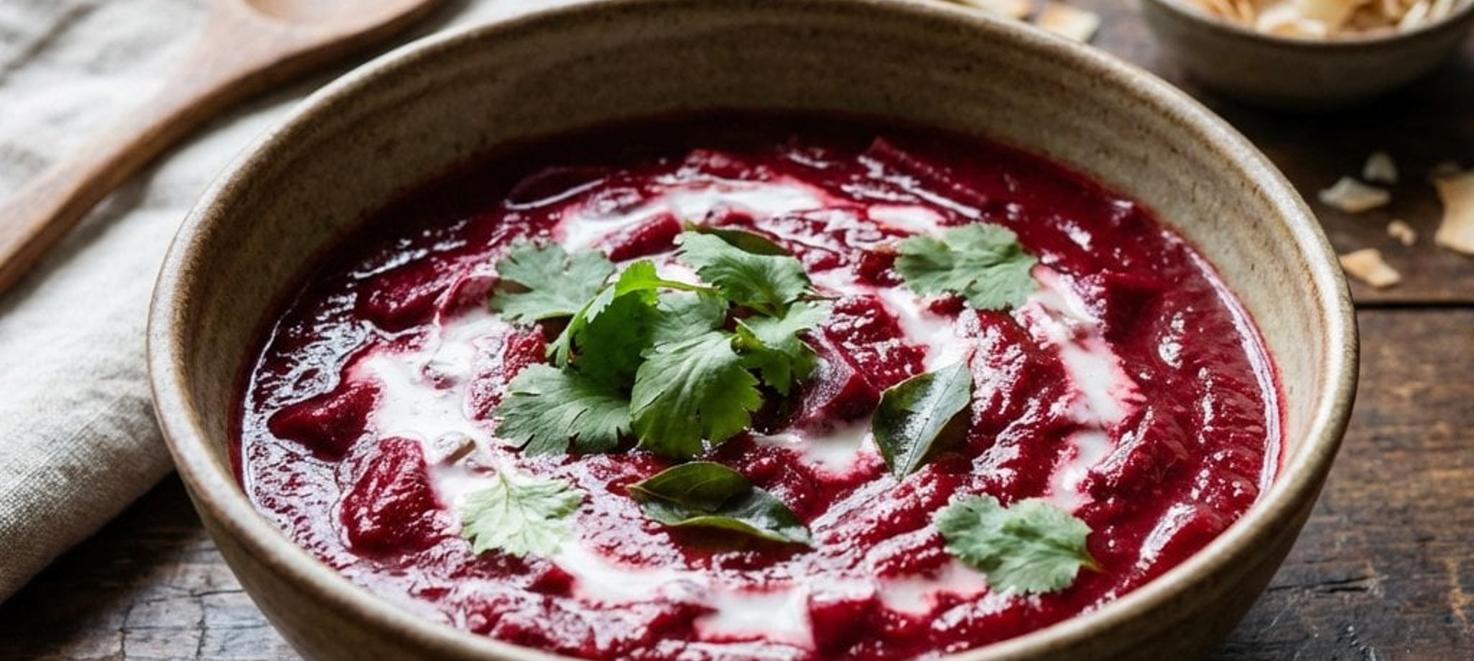 - 5Die Kokosmilch-Wasser-Mischung angießen, umrühren und zum Kochen bringen. Die Hitze weiter reduzieren und das Curry bei gelegentlichem Umrühren ca. 6–8 Minuten köcheln lassen, bis die Rote Bete weich ist.