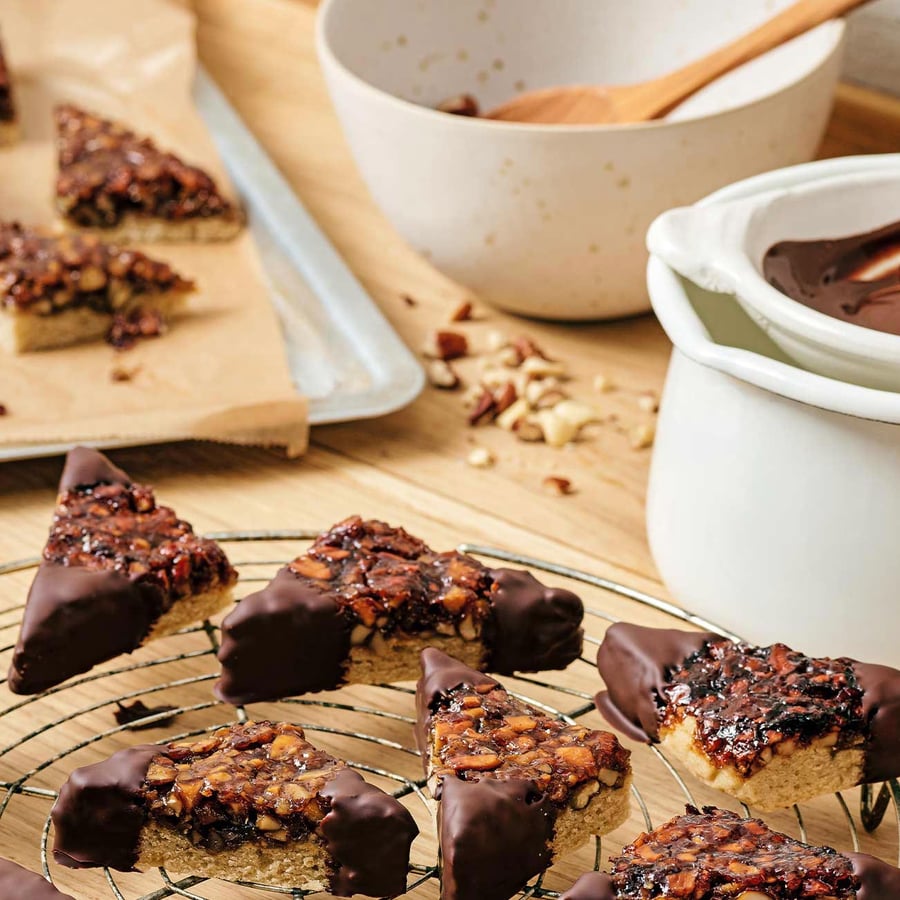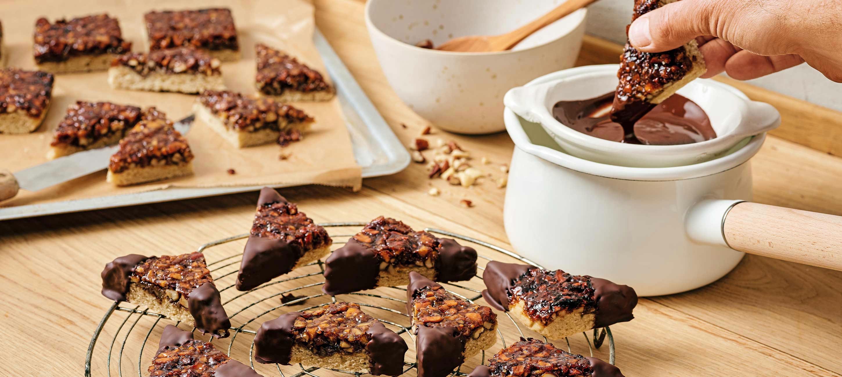 - 4Platte abkühlen lassen. Zunächst in Quadrate und diese dann in Dreiecke schneiden. Schokolade über einem Wasserbad schmelzen und Gebäck damit an 1 oder 2 Ecken schokolieren. Auf einem Kuchengitter vollständig erkalten und durchtrocknen lassen.