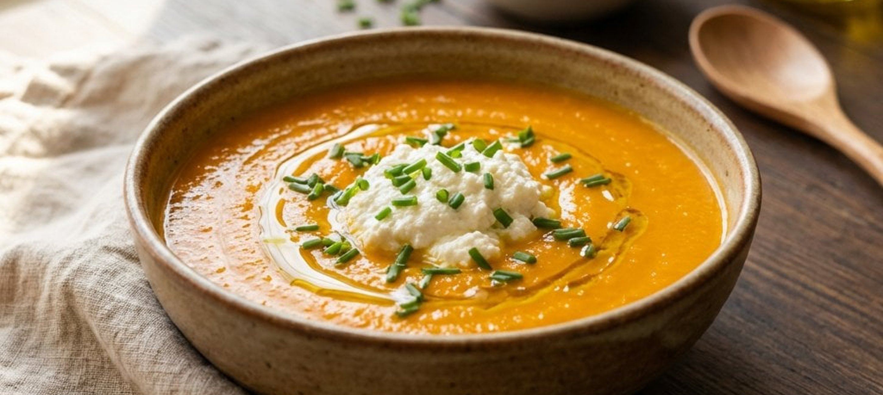 - 5Die Suppe in Schalen füllen, jeweils einen Klecks Ricotta daraufgeben, mit frisch geschnittenem Schnittlauch und etwas Pfeffer garnieren und mit ein paar Tropfen Olivenöl verfeinern.