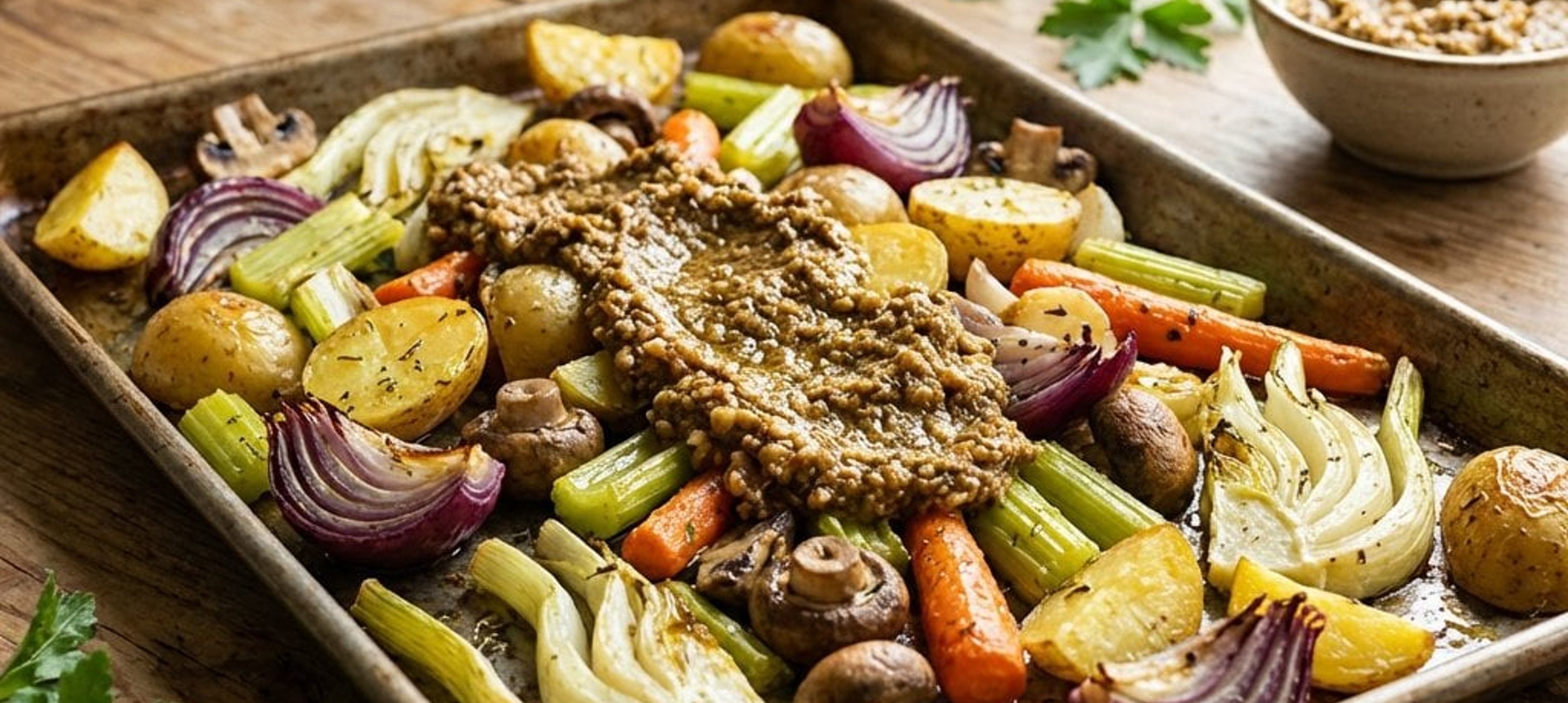 - 4Das gesamte Gemüse einschließlich der gekochten Kartoffeln in einer Schicht auf einem Backblech verteilen. Mit dem restlichen Salz und Pfeffer würzen und mit den restlichen 20 ml Olivenöl beträufeln. Im vorgeheizten Ofen 10–12 Minuten rösten.