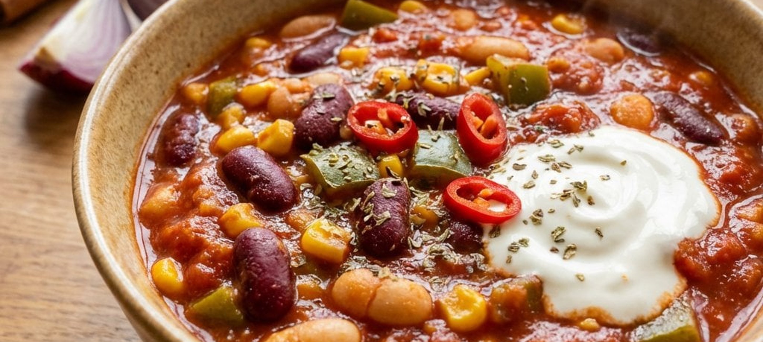 Servieren Sie das Chili mit einem Klecks saurer Sahne, frischem Koriander und knusprigen Tortilla-Chips für das volle mexikanische Erlebnis.