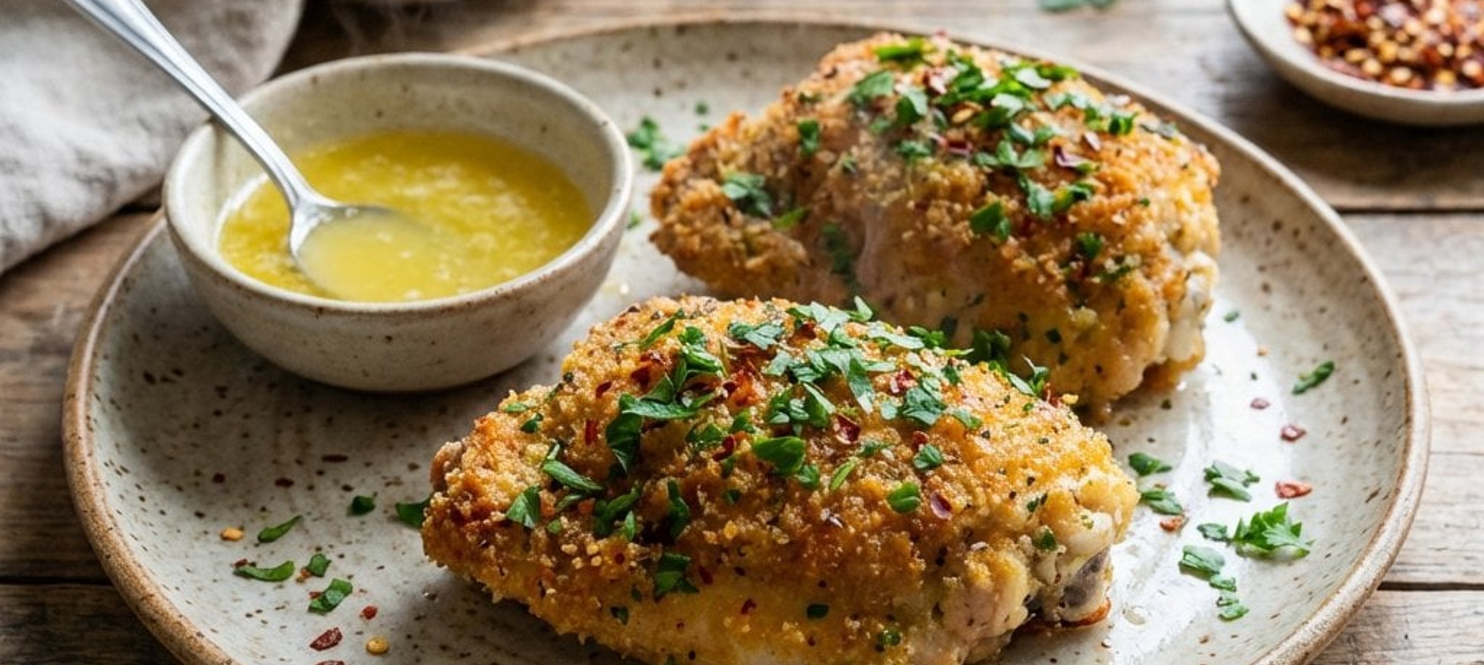 Ein kulinarischer Tipp: Die Zitronensauce gelingt am besten, wenn die Butter wirklich kühlschrankkalt ist und nach und nach untergeschlagen wird. Servieren Sie das Hähnchen sofort, damit die Panade schön knusprig bleibt.