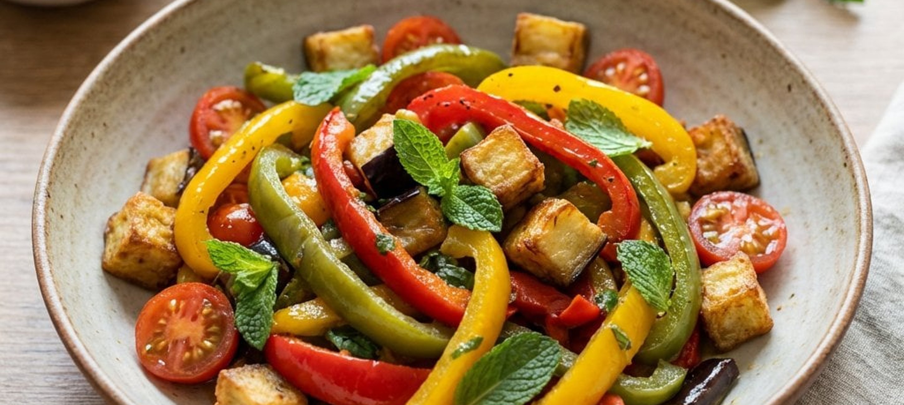 - 6Die frittierten Auberginenwürfel hinzufügen und weitere 5 Minuten garen. Vom Herd nehmen und mit Salz und frisch gemahlenem Pfeffer abschmecken. Die Mischung zu den gerösteten Paprikawürfeln in die Schüssel geben und vorsichtig vermengen. Sobald der Salat abgekühlt ist, die fein geschnittenen Minzblätter unterheben.