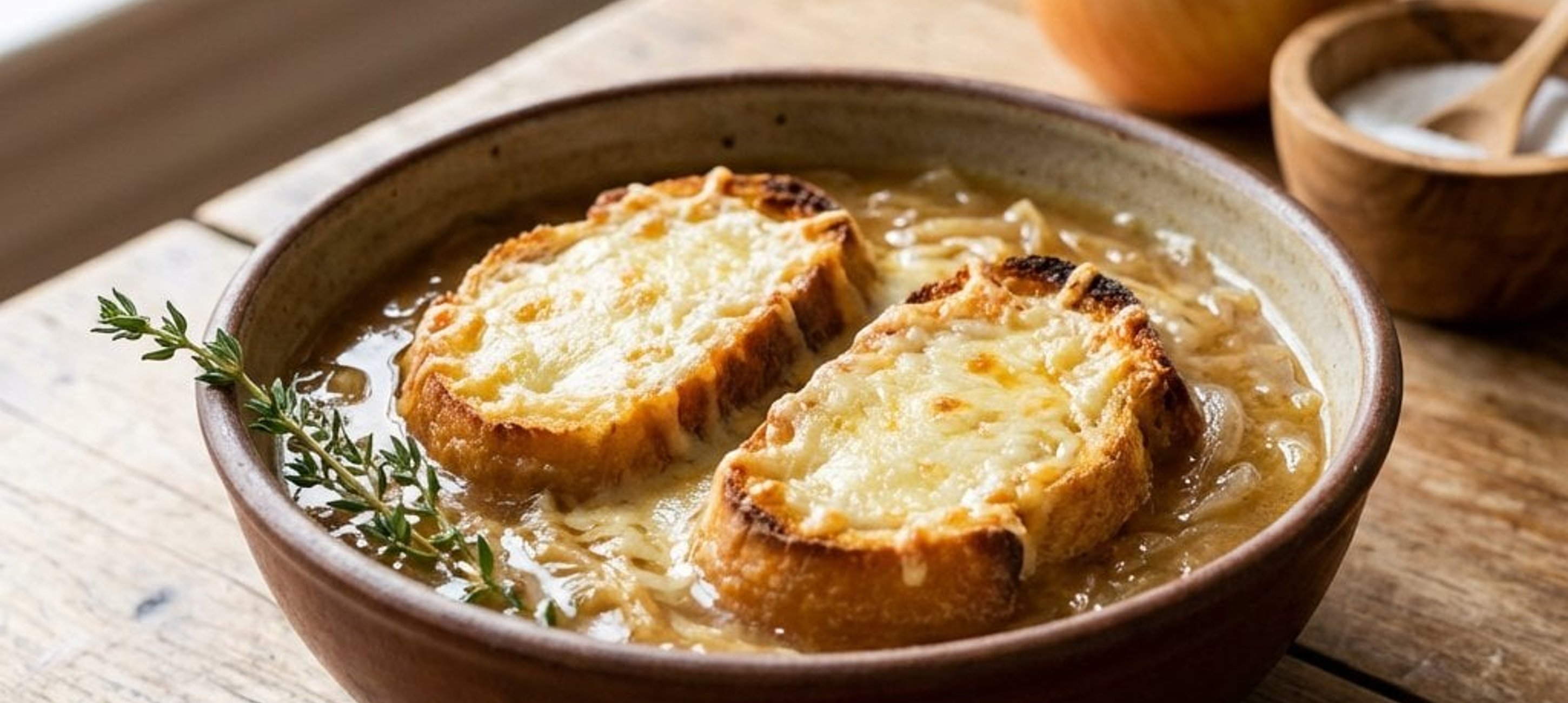 Tipp: Für ein noch intensiveres Aroma können Sie am Ende der Kochzeit einen kleinen Schuss Cognac hinzufügen. Servieren Sie die Suppe in ofenfesten Schalen, um die Baguettescheiben direkt auf der Suppe im Ofen zu gratinieren.