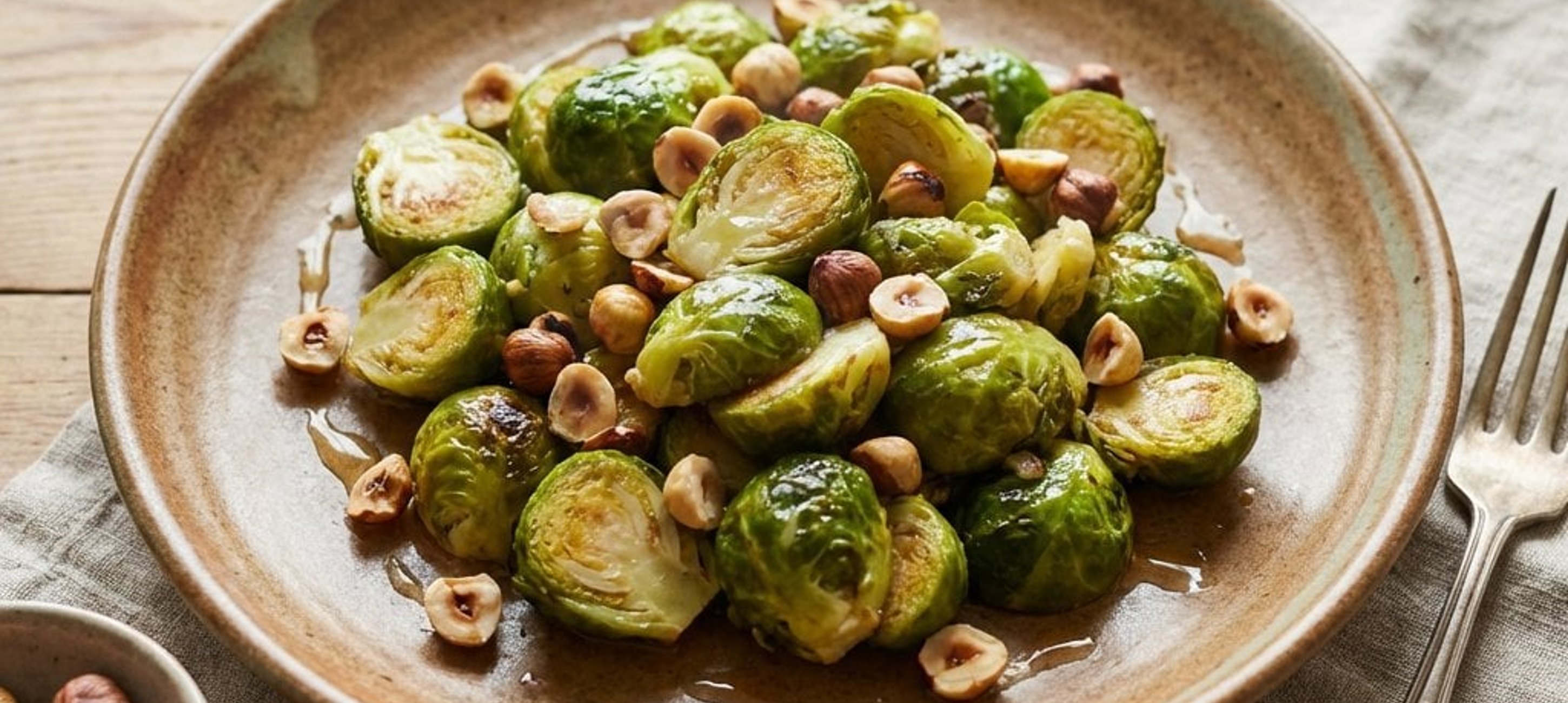 - 2Den Rosenkohl putzen, längs halbieren und in sehr feine Streifen schneiden. In der Pfanne einen Esslöffel Butter schmelzen lassen. Den Rosenkohl hinzufügen und 1–2 Minuten scharf anbraten, bis er bissfest gegart ist.