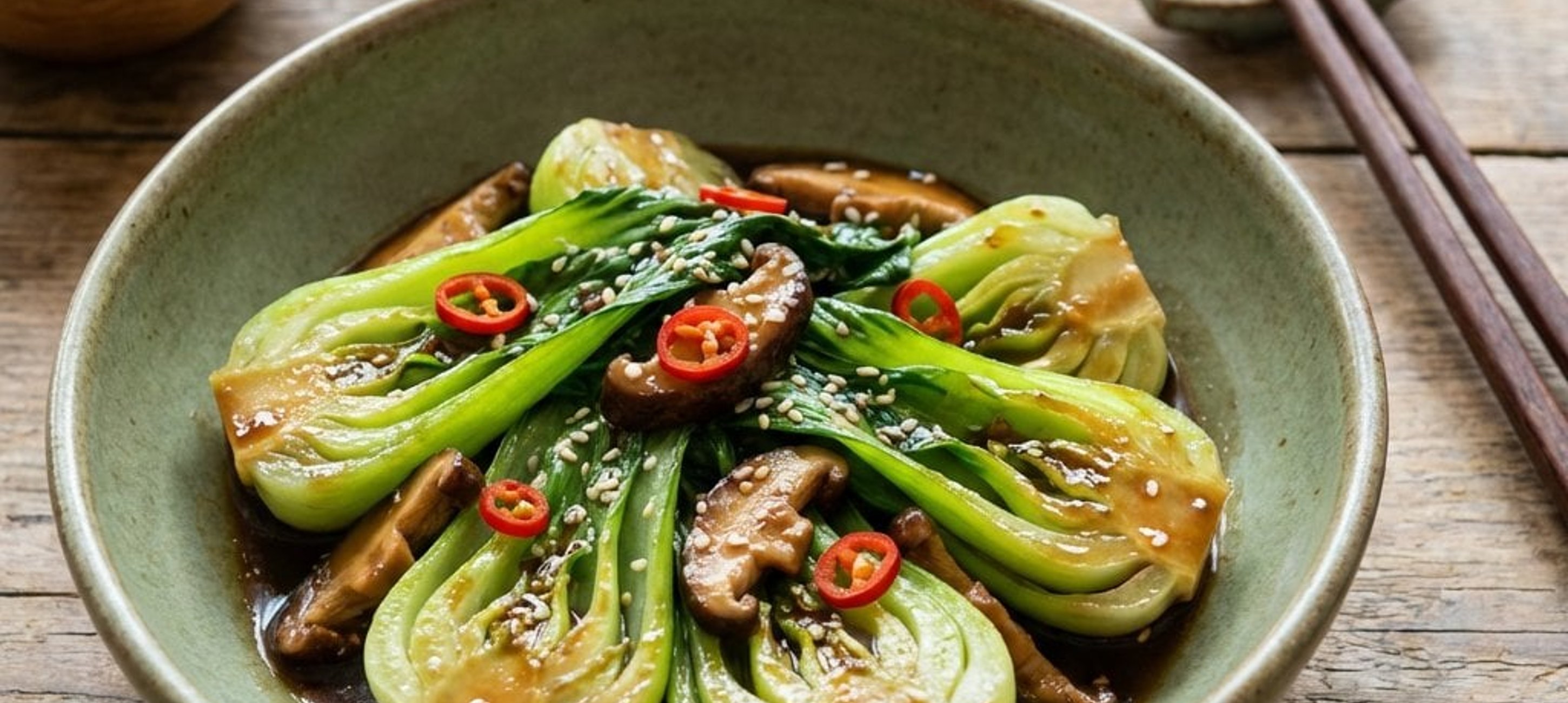 - 3Sesamöl in einer Pfanne oder einem Wok erhitzen. Knoblauch, Ingwer und Chili darin kurz anbraten, bis sie duften. Die Shiitake-Pilze hinzufügen und ca. 3 Minuten scharf anbraten. Dann den Pak Choi dazugeben.