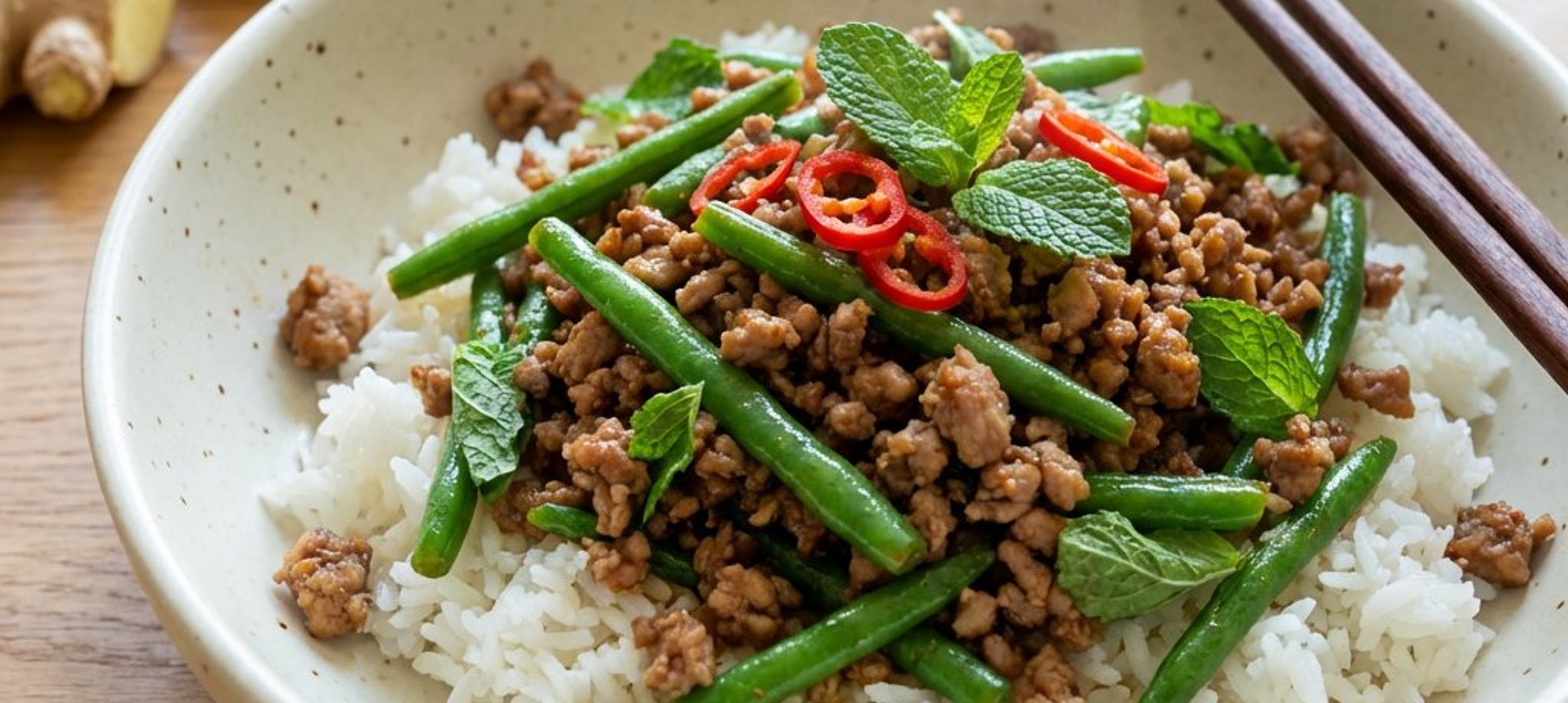 - 2Das Hackfleisch hinzufügen und ca. 2 Minuten scharf anbraten. Dann die Fischsauce und die grünen Bohnen hinzufügen und weitere 3 Minuten gemeinsam braten.