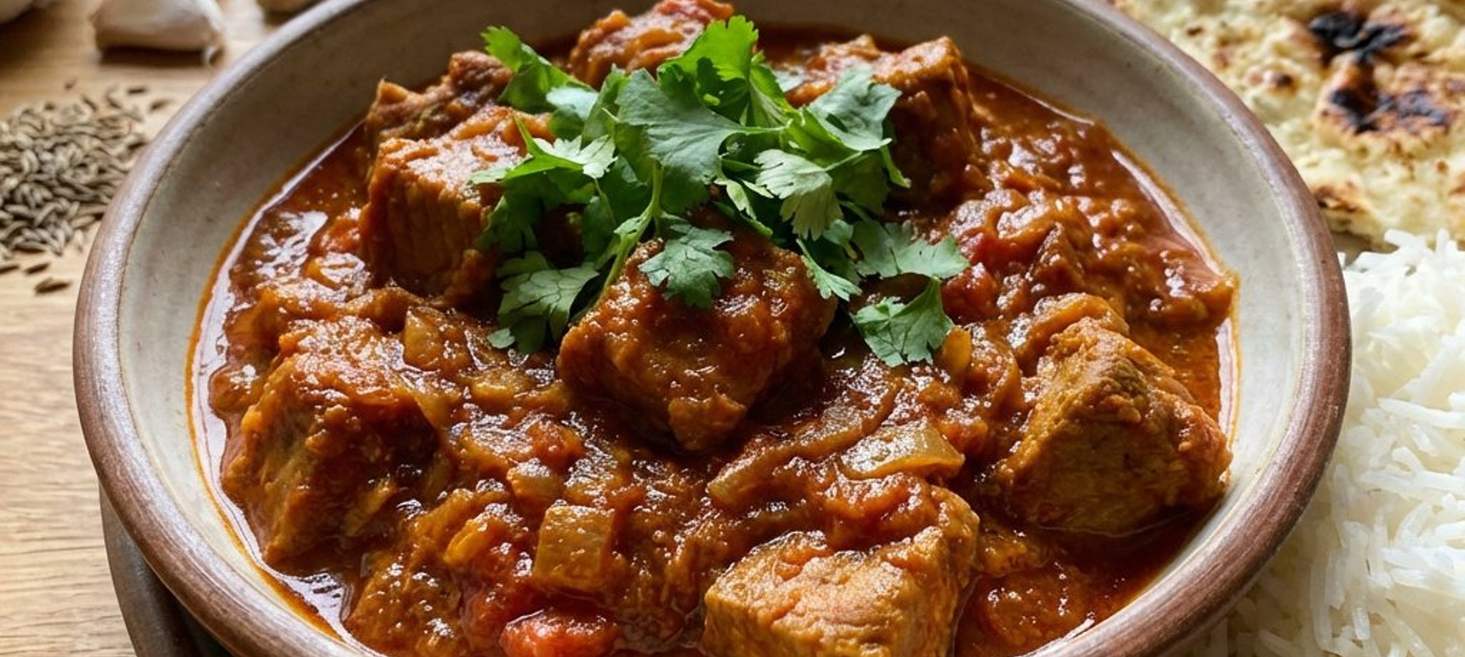 - 4Das fertige Curry mit frischem Koriander garnieren und zusammen mit dem gekochten Basmatireis und dem erwärmten Naan-Brot servieren.