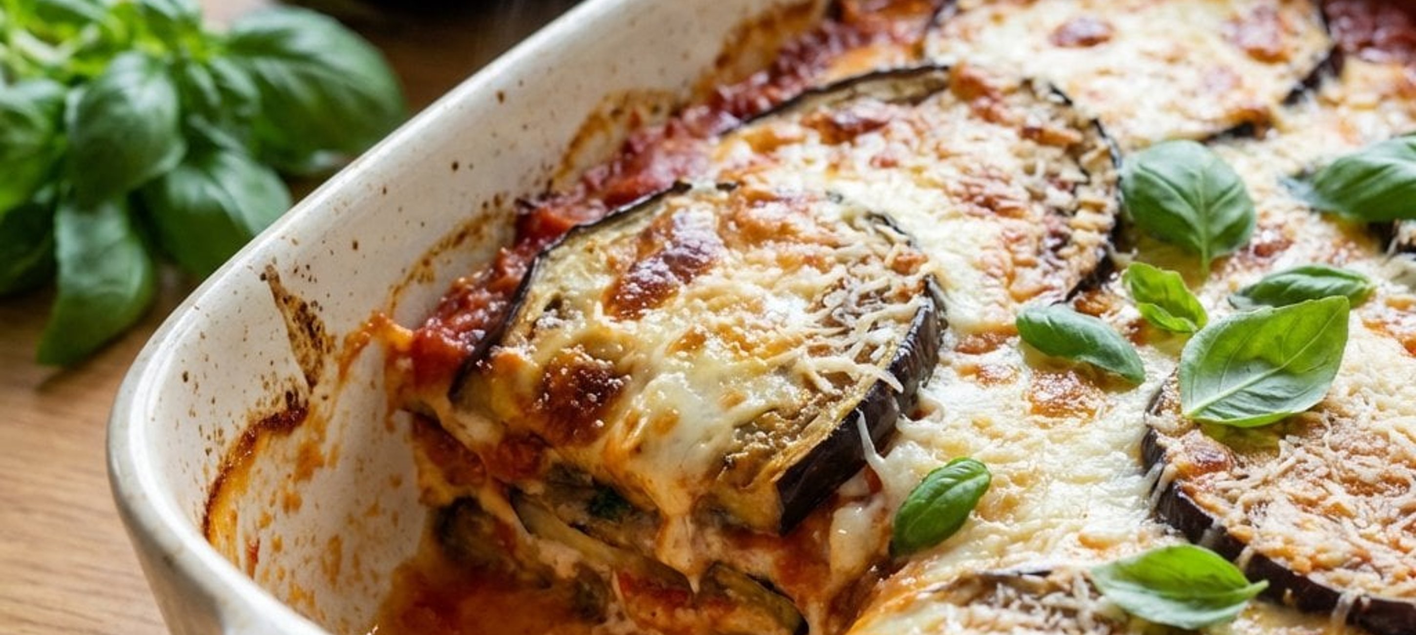 - 4Nun alle Komponenten schichten. In eine Auflaufform (ca. 20x30 cm) 1/3 der Auberginen legen, darauf 1/3 der Tomatensauce verteilen. Eine Schicht Lasagneplatten darauflegen und mit 1/3 der Béchamelsauce bestreichen. Diesen Vorgang noch zweimal wiederholen. Die letzte Schicht Béchamelsauce mit dem restlichen Parmesan bestreuen und die in Scheiben geschnittene Mozzarella darauf verteilen. Die Form mit Alufolie abdecken und 50 Minuten im Ofen backen. Nach der Hälfte der Zeit die Folie entfernen, damit der Käse knusprig wird. Vor dem Servieren mit frischen Basilikumblättern garnieren.