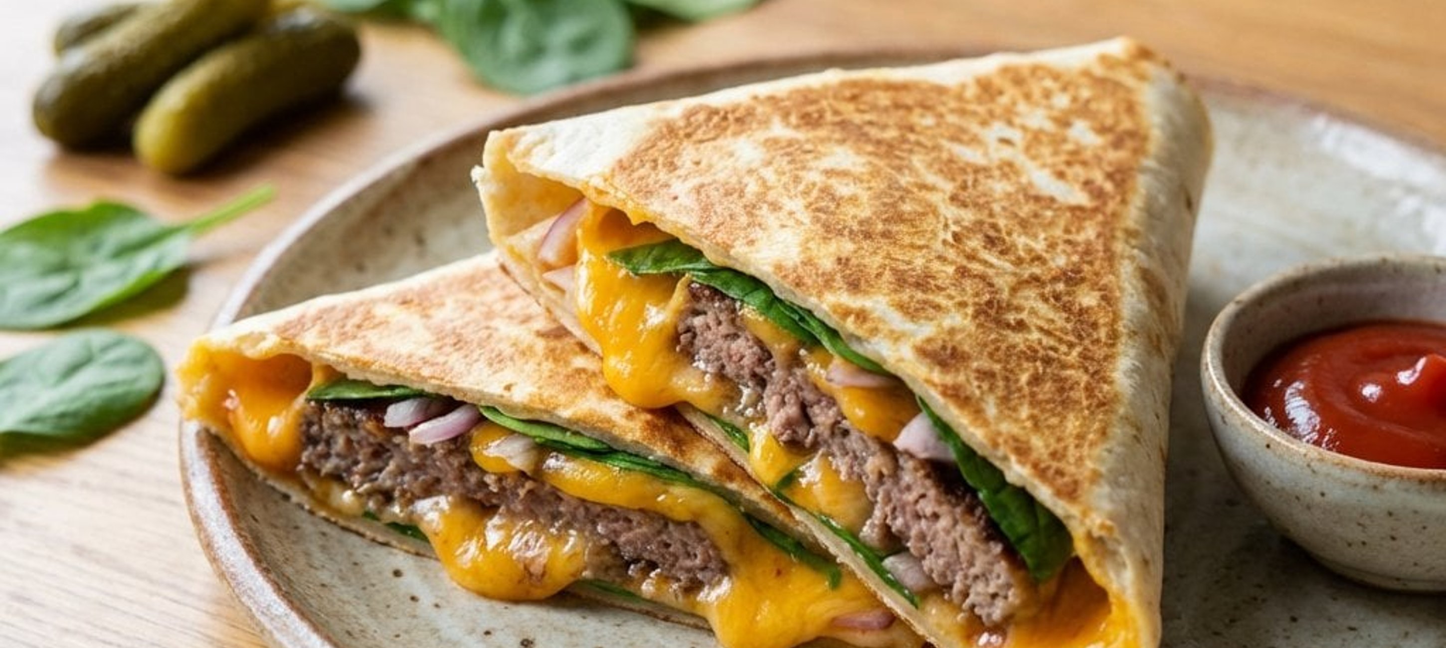 - 3Stellen Sie sich die Tortilla in vier Viertel unterteilt vor. Jedes Viertel wird nun unterschiedlich belegt: Legen Sie das fertige Burger-Pattie in das erste Viertel (links vom Schnitt). Legen Sie eine Scheibe Cheddar in das zweite Viertel. Im dritten Viertel verteilen Sie die fein gewürfelte Schalotte, in Scheiben geschnittene Gewürzgurken und ein paar Blätter Babyspinat. Bestreichen Sie das letzte Viertel großzügig mit Ketchup.