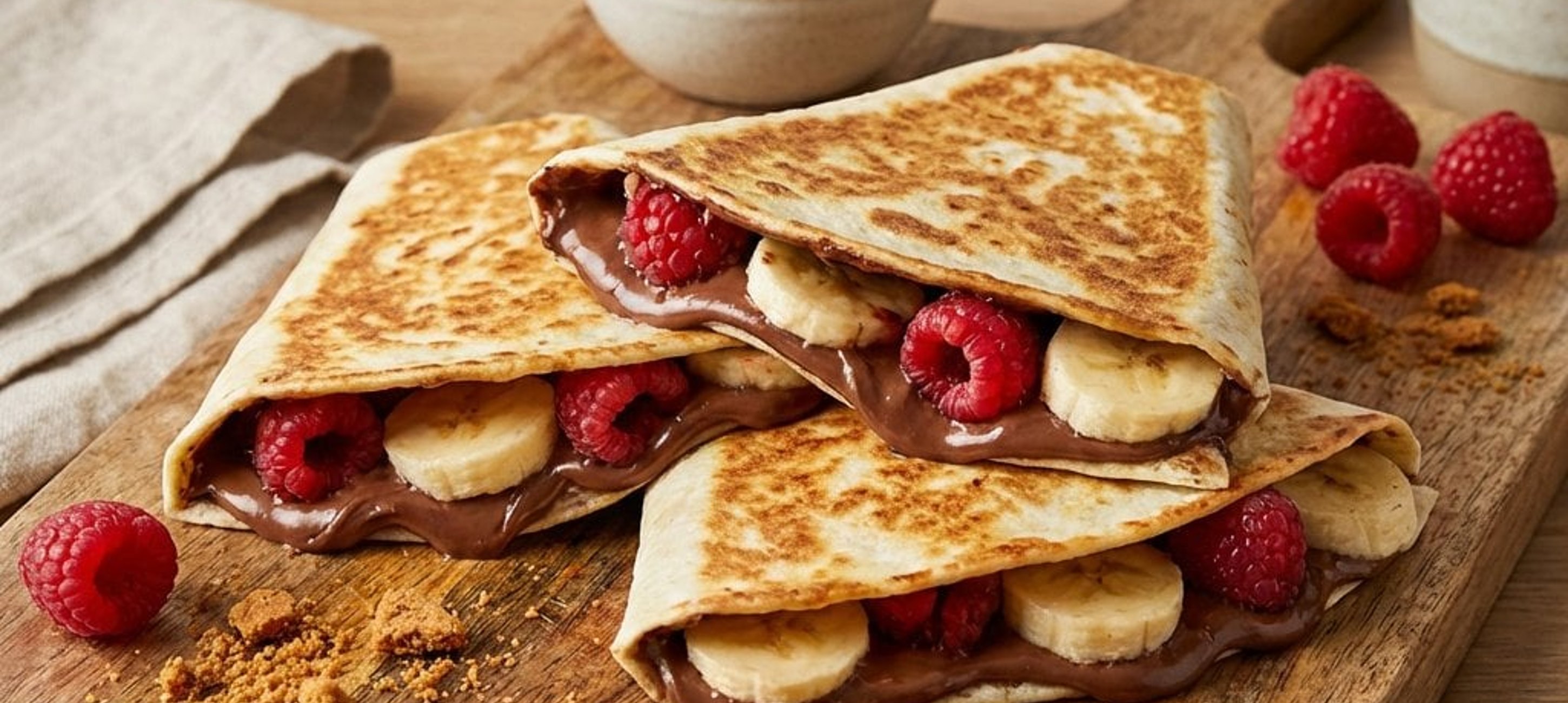 - 6Die gefaltete Tortilla in einer trockenen Pfanne, einem Kontaktgrill oder einem Sandwichmaker von beiden Seiten goldbraun anrösten, bis die Schokolade leicht geschmolzen ist.