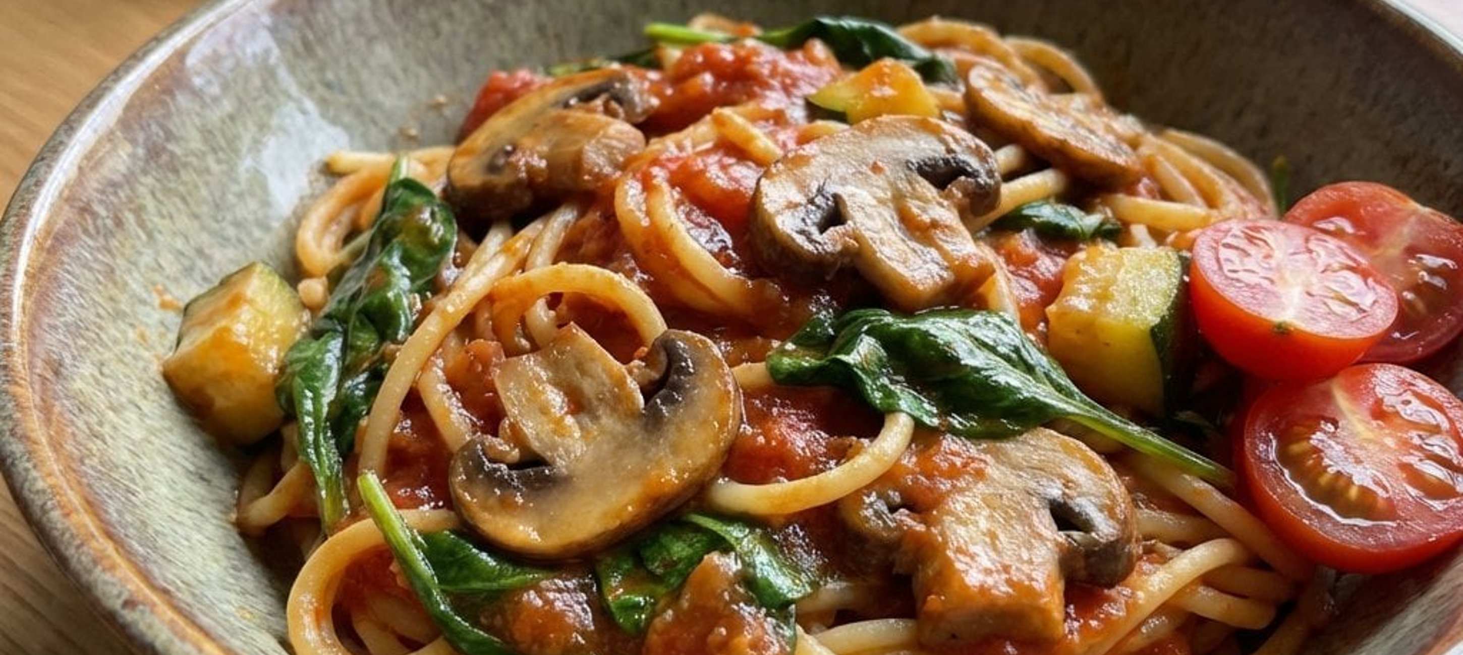 - 2Die Zucchini und Tomaten in Würfel schneiden, die Champignons in Scheiben schneiden. Das vorbereitete Gemüse zusammen mit dem Babyspinat in den Topf geben. Alles gut vermengen.