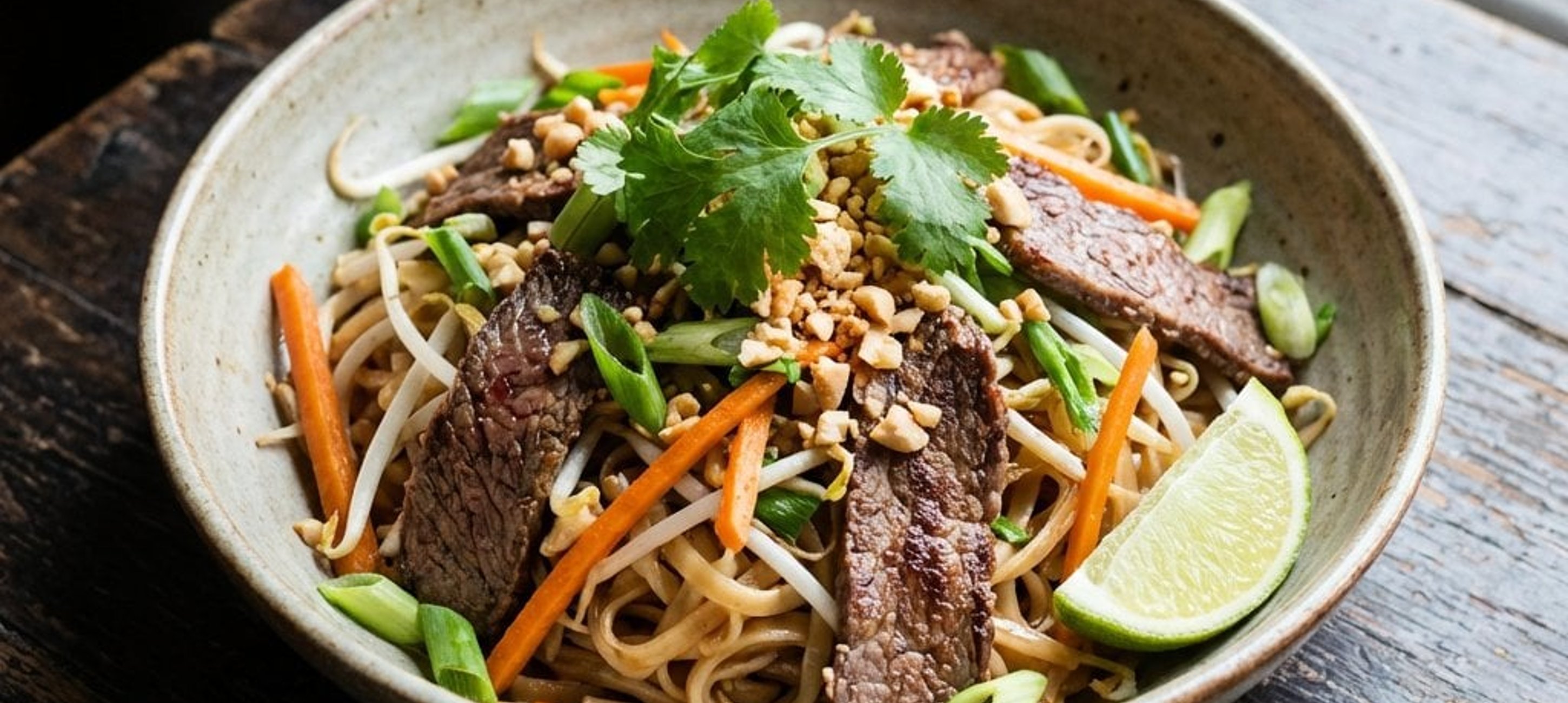 - 1Die gebratenen Nudeln auf Tellern anrichten, großzügig mit frischem Koriander und zerstoßenen Erdnüssen bestreuen. Mit Limettenspalten servieren.