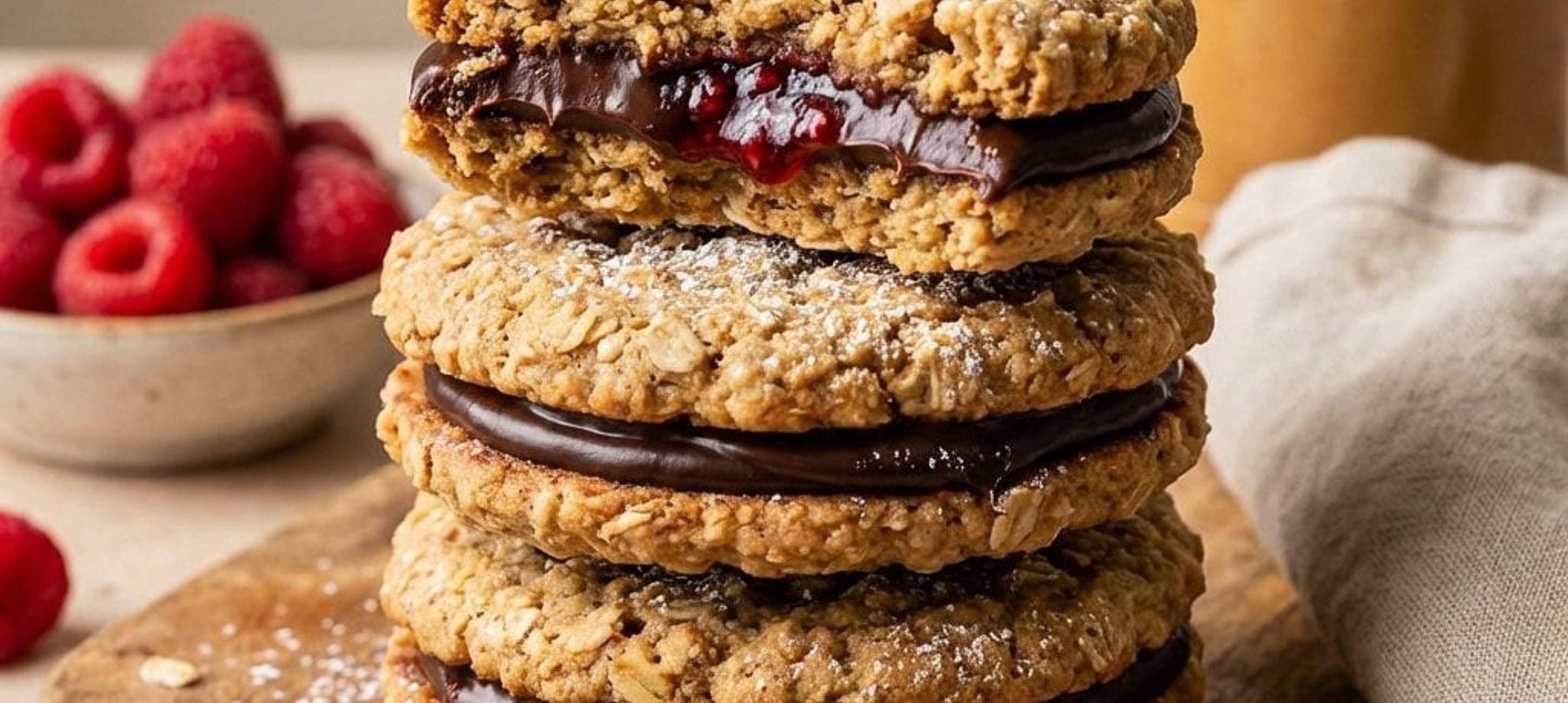 - 2Auf die andere Hälfte der Kekse mit einem Spritzbeutel einen Ring aus der Schokoladenfüllung spritzen (die Mitte frei lassen). In die Mitte einen Teelöffel der Himbeerfüllung geben. Die verzierten Oberseiten vorsichtig aufsetzen und die Kekse im Kühlschrank fest werden lassen.