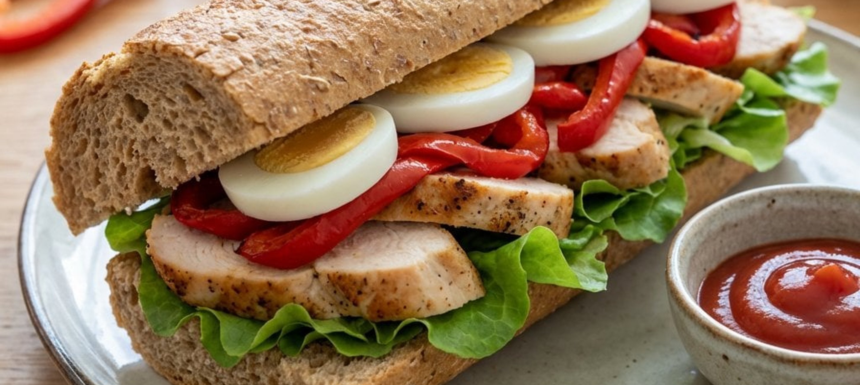 - 4Die Baguettes aufschneiden und die Innenseiten mit Ketchup bestreichen. Mit Blattsalat belegen, darauf die Hähnchenstreifen, Eischeiben und die gerösteten Paprikastücke verteilen. Zuklappen und genießen.