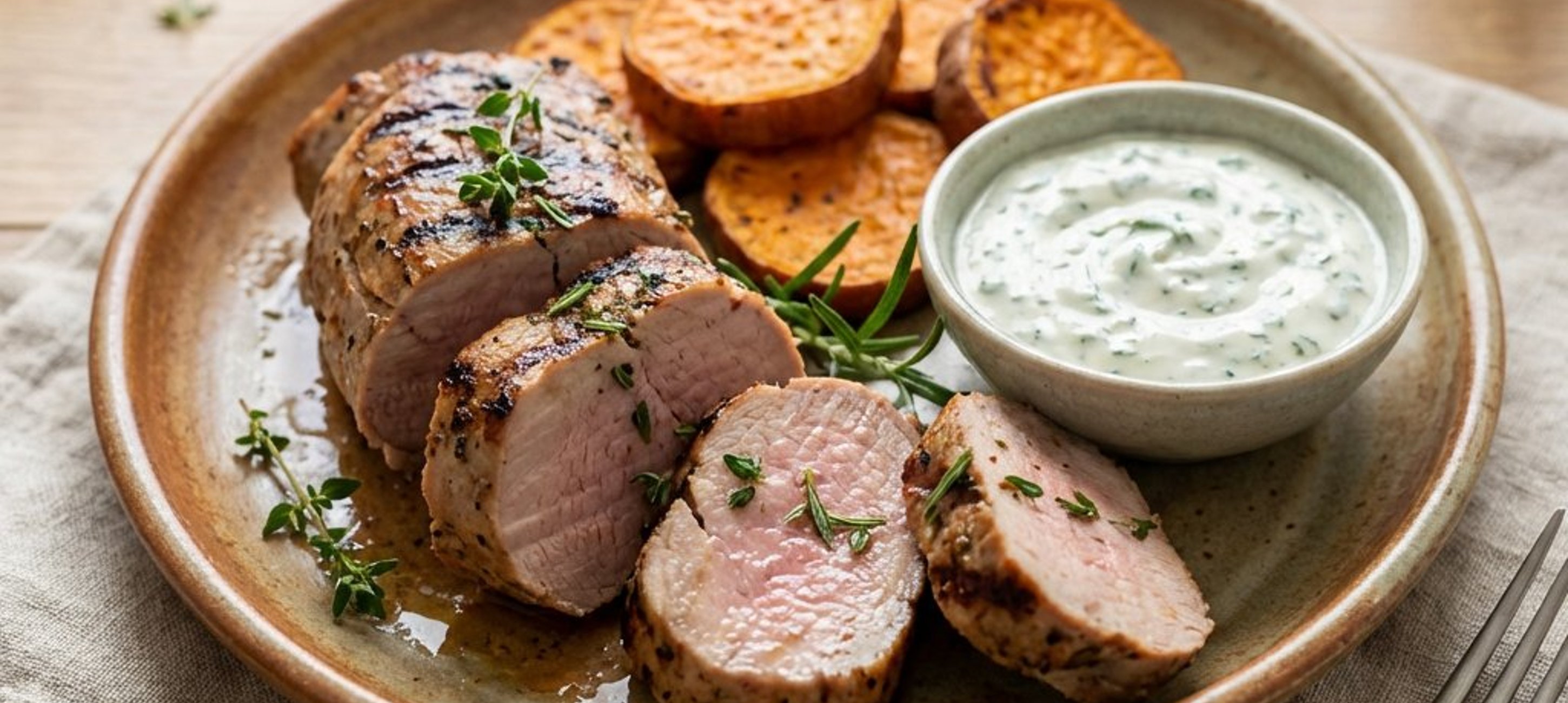 - 1Für den Dip die saure Sahne mit dem fein gehackten Schnittlauch vermischen. Mit Salz, Pfeffer und Knoblauchpulver abschmecken. Das Fleisch kurz ruhen lassen, aufschneiden und zusammen with den Süßkartoffeln und dem Dip servieren.