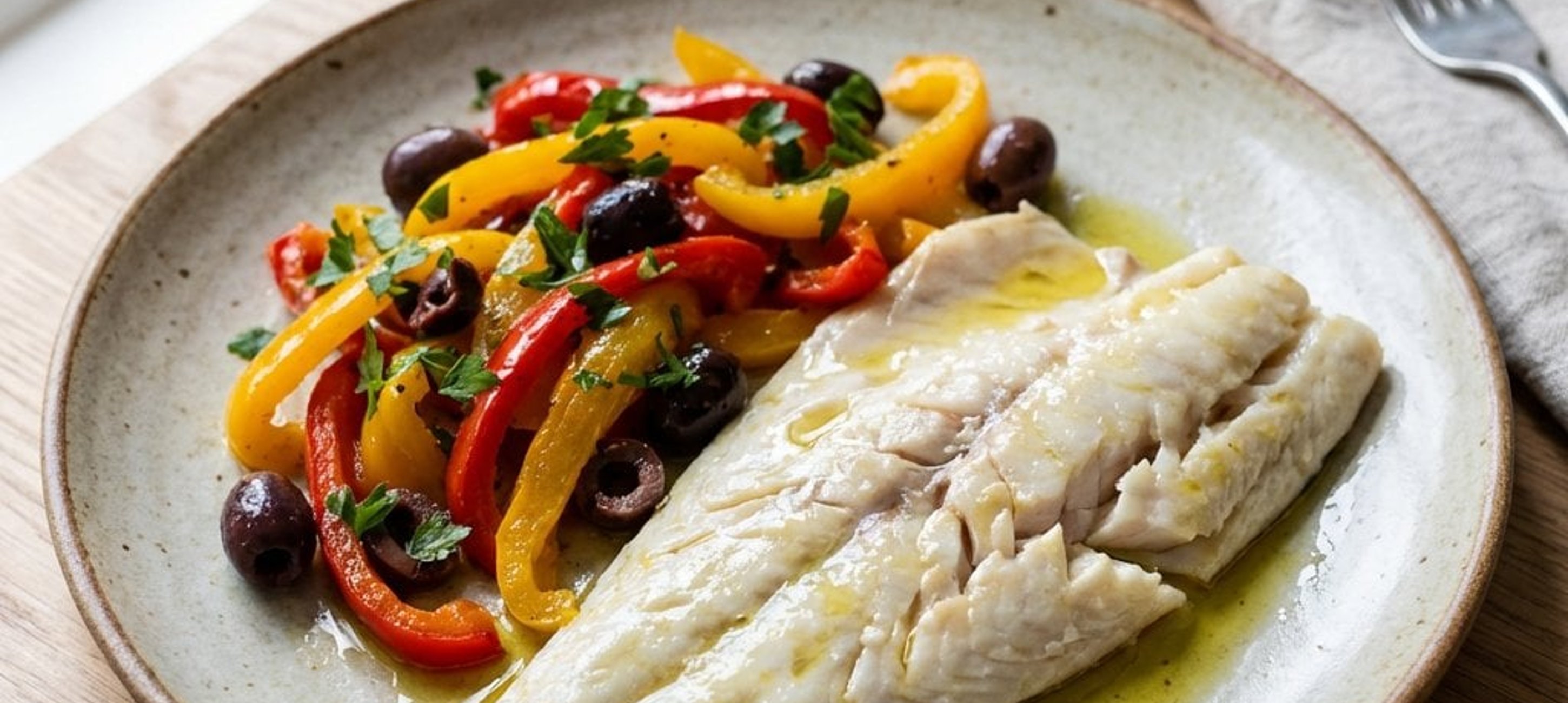 - 2Die gerösteten Paprikas in einen Beutel geben oder abdecken und abkühlen lassen. Danach die Haut abziehen, Kerne entfernen und das Fruchtfleisch in Würfel schneiden. Mit geschnittenen Oliven, Petersilie, Zitronensaft und dem restlichen Olivenöl (15 ml) vermischen. Mit Salz und Pfeffer abschmecken und im Kühlschrank kalt stellen. Den Salat zusammen mit dem frisch konfitierten Fisch servieren.