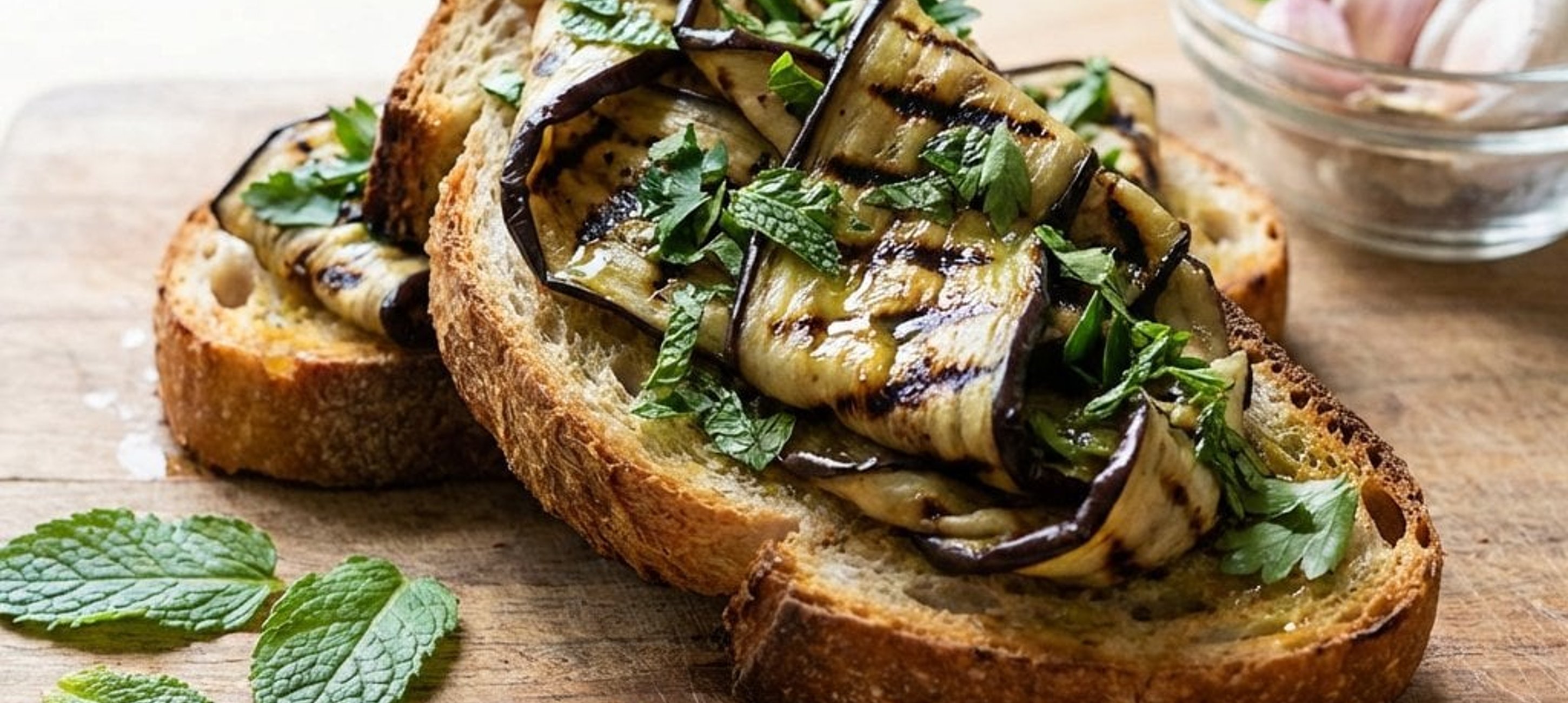 - 3Die Brotscheiben halbieren und im Ofen, Toaster oder auf dem Grill knusprig rösten. Die warmen Brote mit der zweiten Knoblauchzehe einreiben und mit etwas Olivenöl beträufeln. Die Auberginenmischung großzügig auf dem Brot verteilen und sofort servieren.