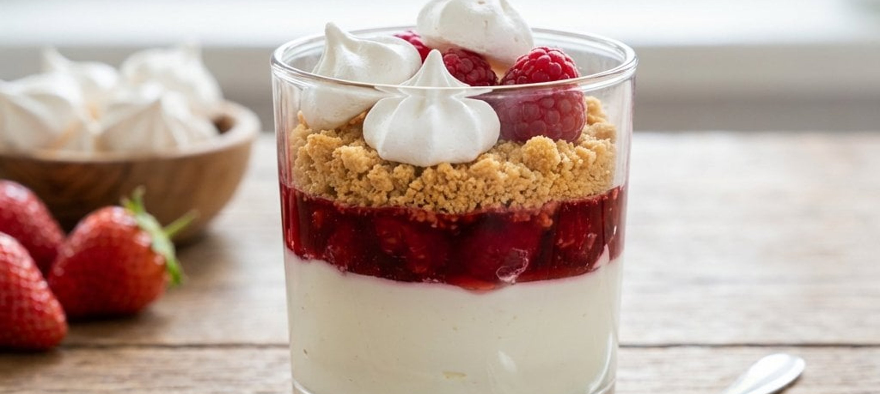 - 1Die Butterkekse grob zerbröseln. In Gläser abwechselnd Kekskrümel, die beiden Cremes, das Kirschgelee und frische Beeren schichten. Mit Baisers und restlichen Früchten garnieren.