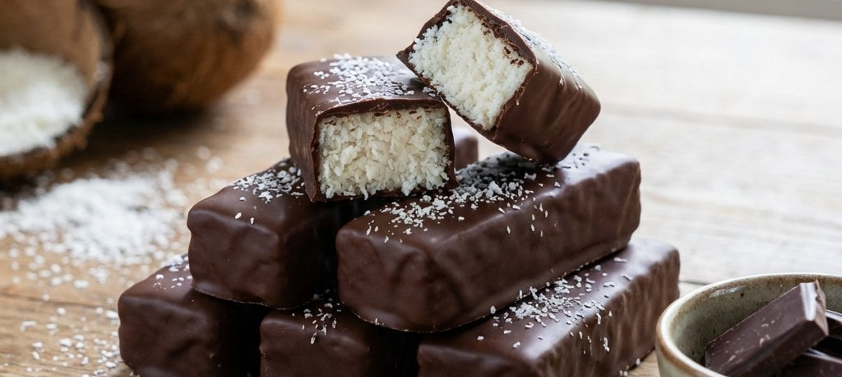 - 2Die gekühlte Kokos-Schicht aus dem Gefrierfach nehmen, gleichmäßig mit der geschmolzenen Schokolade überziehen und weitere 5 Minuten fest werden lassen.