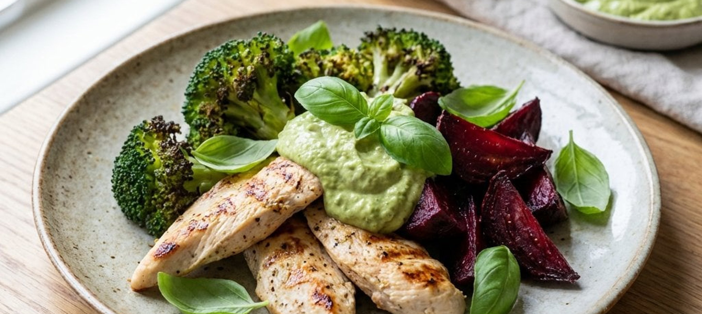 - 2Die gebratenen Hähnchenbruststreifen auf 4 Tellern verteilen und mit dem Brokkoli sowie der marinierten Roten Bete anrichten. Jede Portion mit dem Avocado-Pesto toppen und nach Belieben mit frischen Basilikumblättern garnieren.