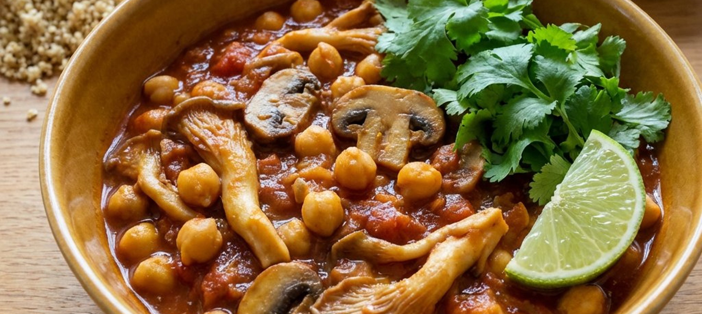 - 4Die Kichererbsen-Pfanne zusammen mit dem Vollkorn-Couscous anrichten. Jede Portion mit frisch gezupftem Koriander und einer Limettenspalte garnieren.
