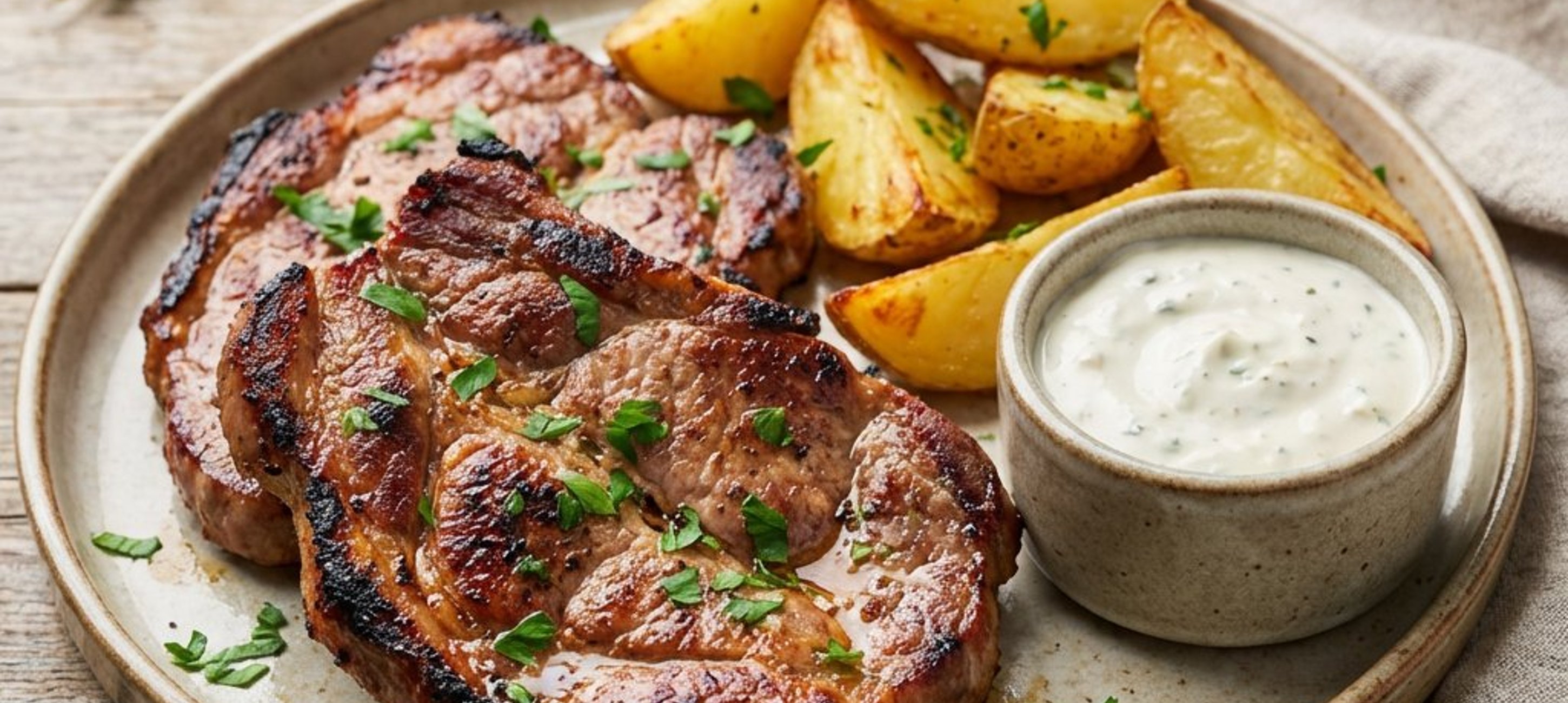 - 2Legen Sie die marinierten Nackenkoteletts in die Mitte des Grillrosts und grillen Sie sie 3–4 Minuten pro Seite. Schieben Sie das Fleisch anschließend in einen Bereich mit niedrigerer Temperatur oder auf den Warmhalterost, schließen Sie den Grilldeckel und lassen Sie das Fleisch ca. 5–6 Minuten gar ziehen. Währenddessen den Dip zubereiten: Den griechischen Joghurt mit gepressten Knoblauchzehen und einer Prise Salz glatt rühren.