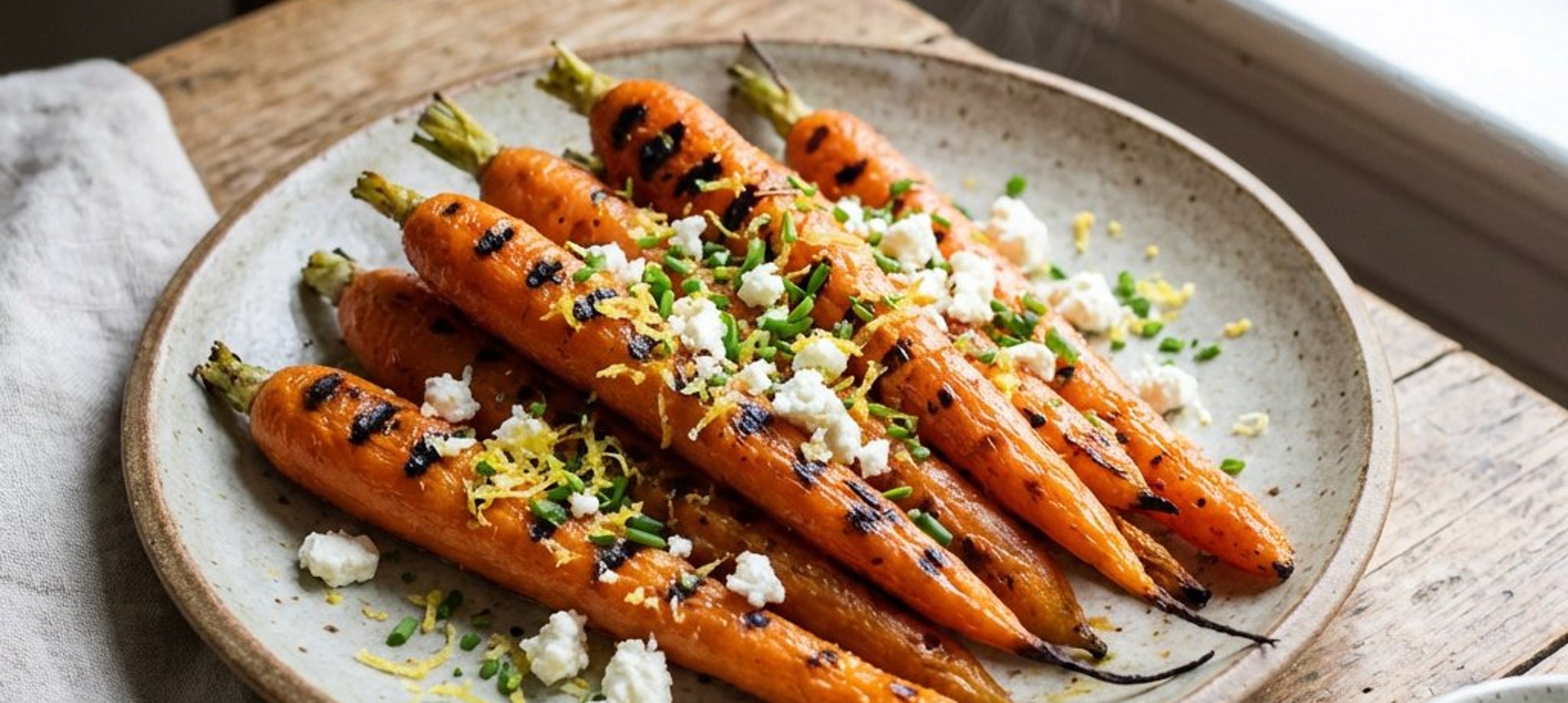 - 5Sobald die Karotten eine schöne braune Farbe haben, vom Grill nehmen, direkt in die Schüssel mit der Marinade geben und gründlich vermengen, sodass sie vollständig bedeckt sind. Auf einem Teller anrichten, mit zerbröseltem Feta und fein geschnittenem Schnittlauch bestreuen und servieren.