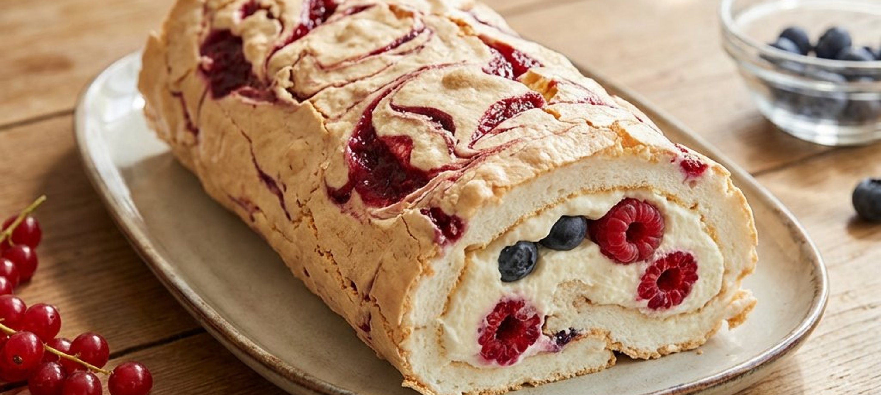 - 1Ein frisches Stück Backpapier und ein Küchentuch bereitlegen. Den Baiser-Boden vorsichtig darauf stürzen und das mitgebackene Papier abziehen. Die Schlagsahne steif schlagen und auf dem Boden verteilen. Das restliche Fruchtpüree in Klecksen daraufgeben und die restlichen 200 g frischen Beeren gleichmäßig verteilen. Die Roulade von der langen Seite her mithilfe des Tuchs vorsichtig, aber straff aufrollen. In Papier und Tuch gewickelt für ca. 2 Stunden im Kühlschrank fest werden lassen.