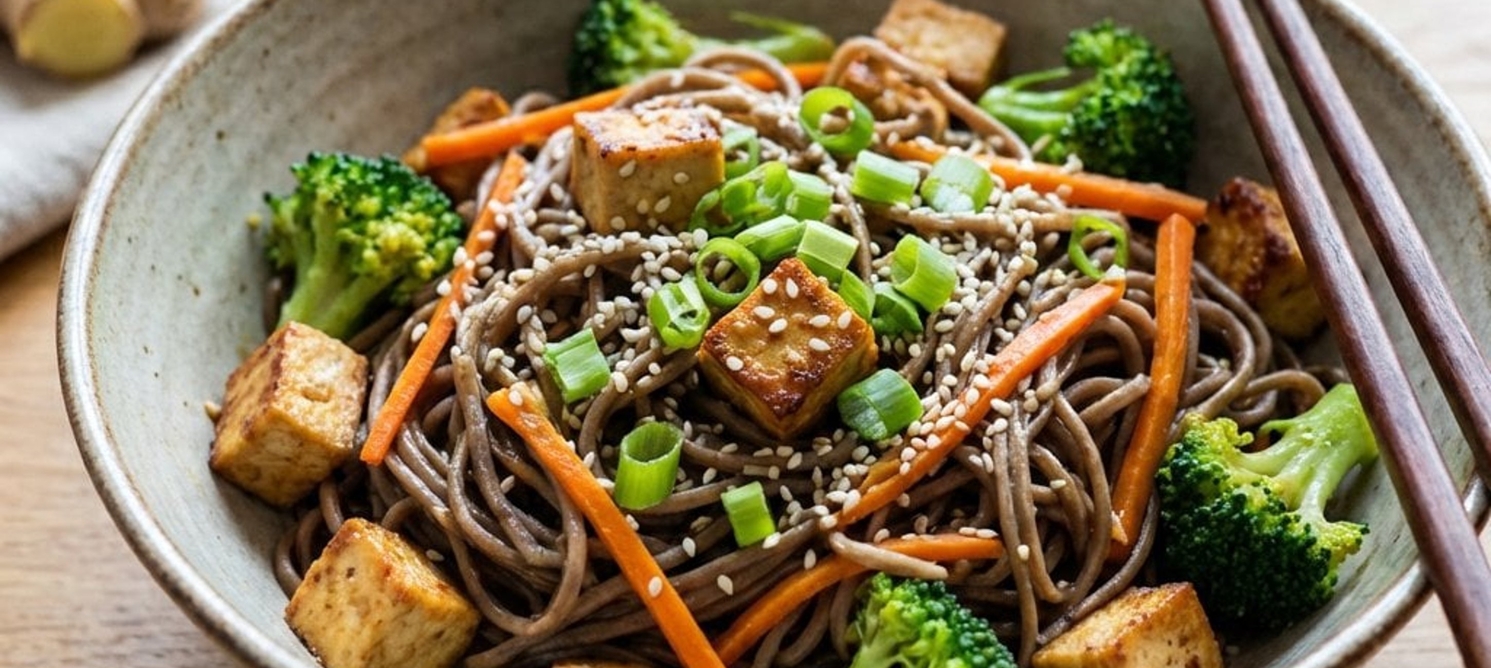 - 5Tofu-Würfel, Soba-Nudeln, in Streifen geschnittene Karotten und die restliche Sauce hinzufügen. Alles gut vermengen und kurz erhitzen.