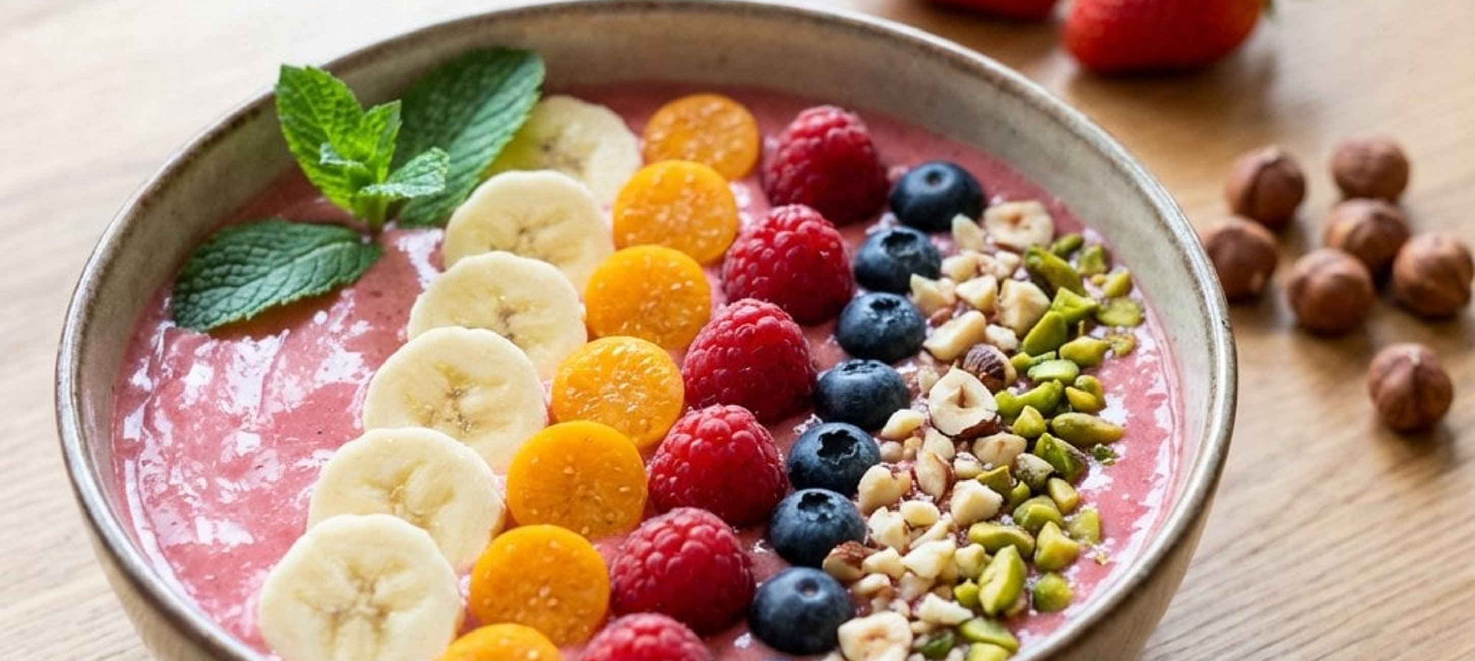 - 2Den Smoothie in zwei Schalen füllen. Die zweite Banane in Scheiben schneiden. Die Bowl mit den Bananenscheiben, Physalis, frischen Himbeeren, Heidelbeeren, gehackten Haselnüssen und Pistazien garnieren.