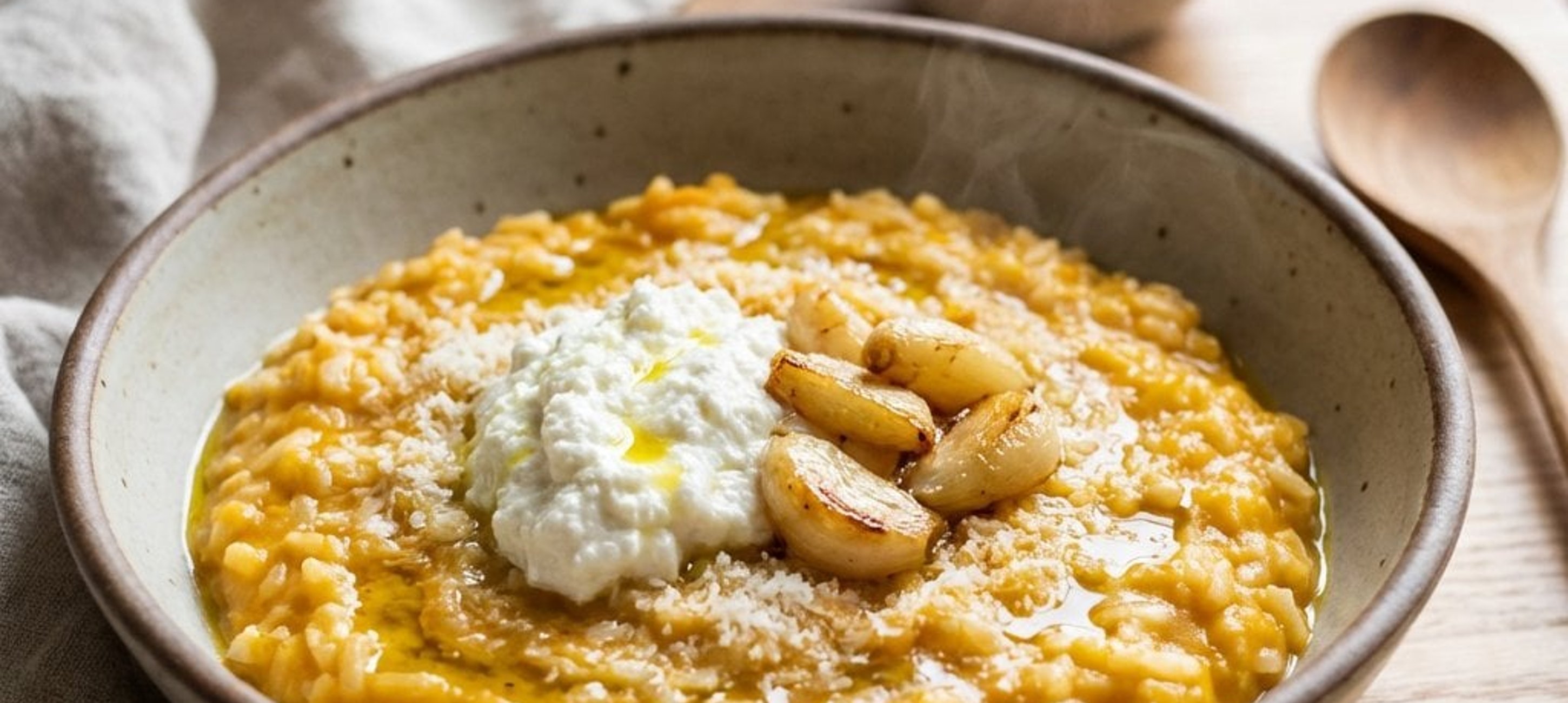 - 9Das Kürbispüree unter den fertigen Reis rühren. Den fein geriebenen Parmesan hinzufügen, alles gut vermengen und mit Salz und Pfeffer abschmecken. Das Risotto sollte eine cremige, leicht flüssige Konsistenz haben.