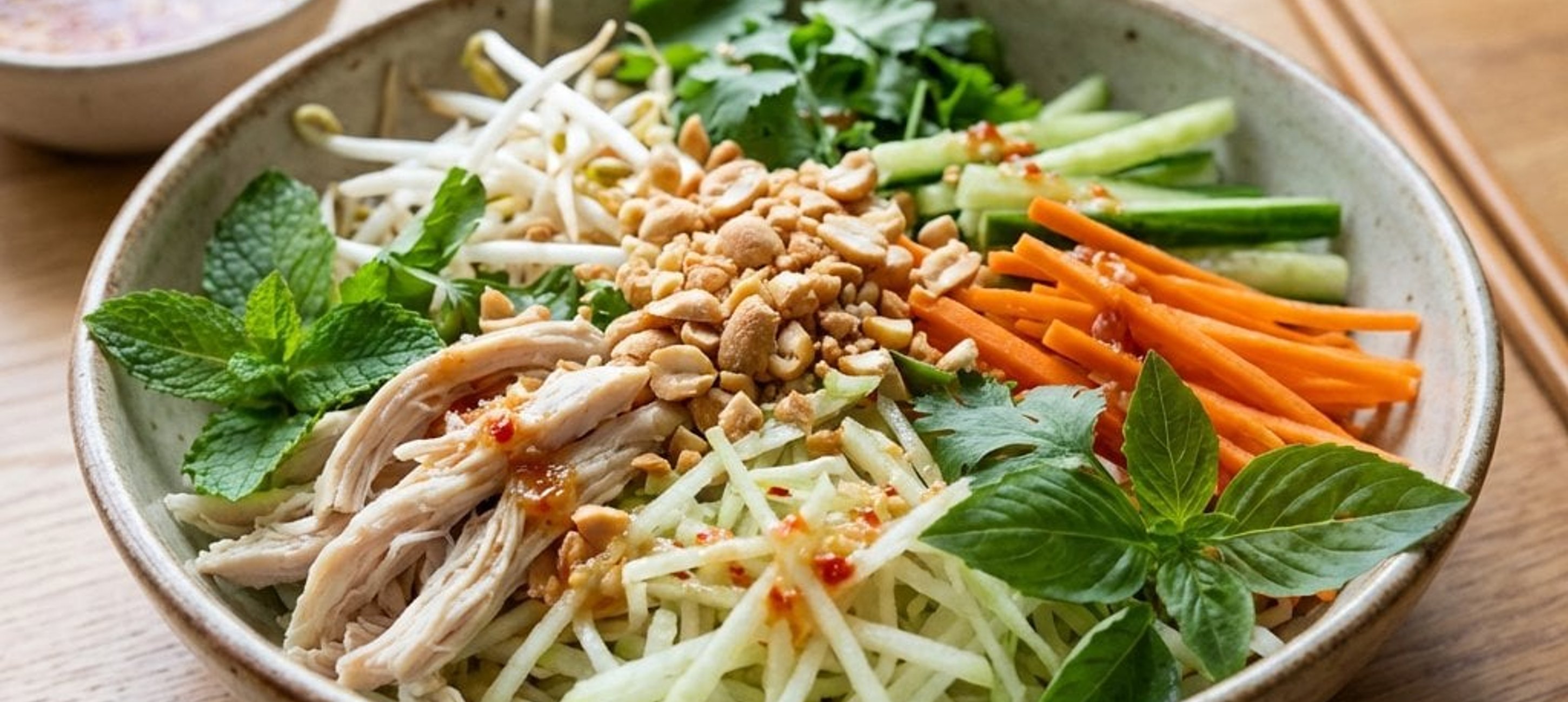 - 1Den Salat in der Schüssel gut vermengen, die Hähnchenstreifen hinzufügen. Für das Dressing Fischsauce, Limettensaft, Rohrzucker, die Hälfte der gehackten Chili und den Knoblauch verrühren, bis sich der Zucker gelöst hat. Das Dressing über den Salat geben und alles gut vermischen. Die restliche Chili dient als Garnitur oder für zusätzliche Schärfe.
