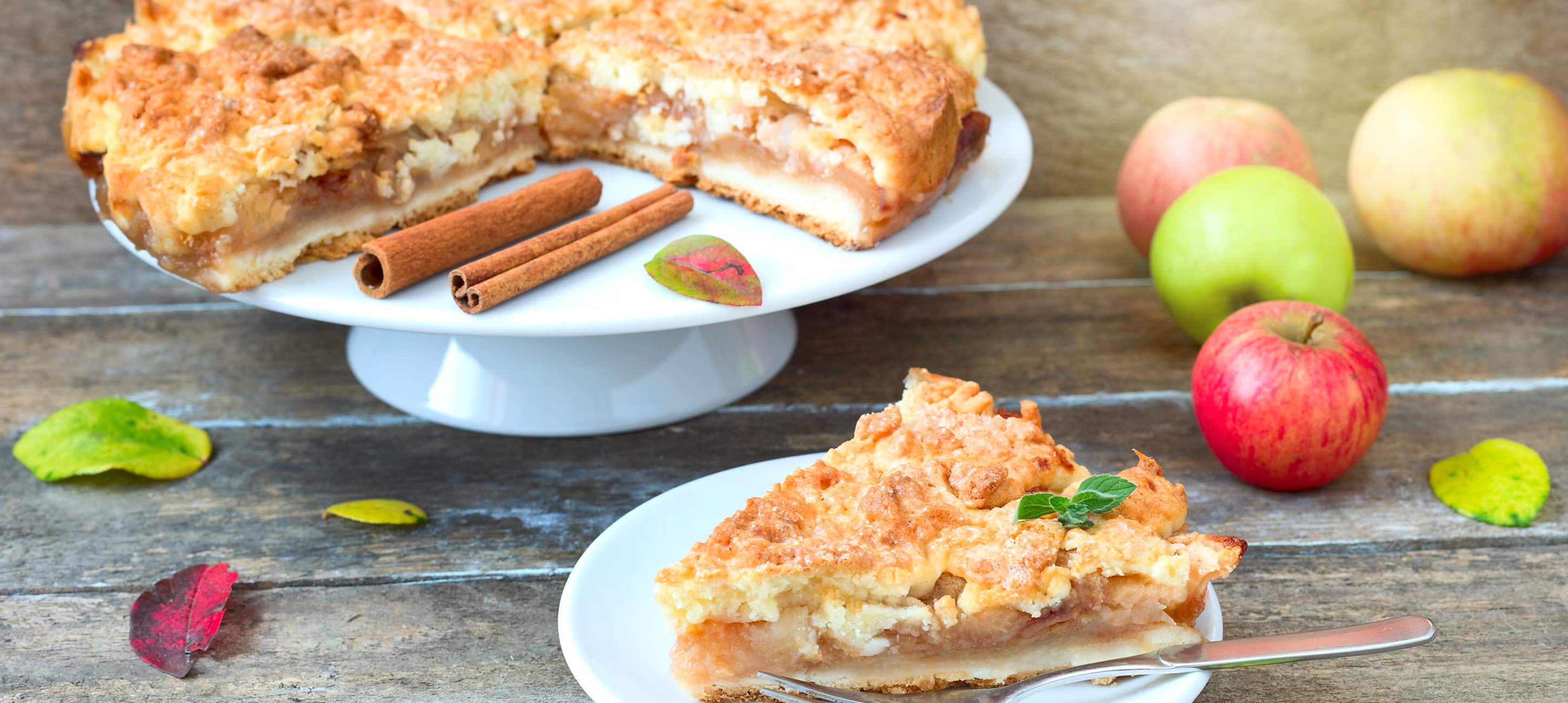 - 5Jetzt die Hälfte des Teigs in einer gefetteten und bemehlten Springform (Durchmesser 24 cm) zu einem gleichmäßigen Kuchenboden flachdrücken und anschließend mit den Apfelscheiben belegen. Hierüber dann die übrigen Streusel verteilen. Im vorgeheizten Backofen ca. 40 Minuten bei 175 °C Umluft goldbraun backen. Abschließend Puderzucker über den Apfelkuchen streuen und servieren.