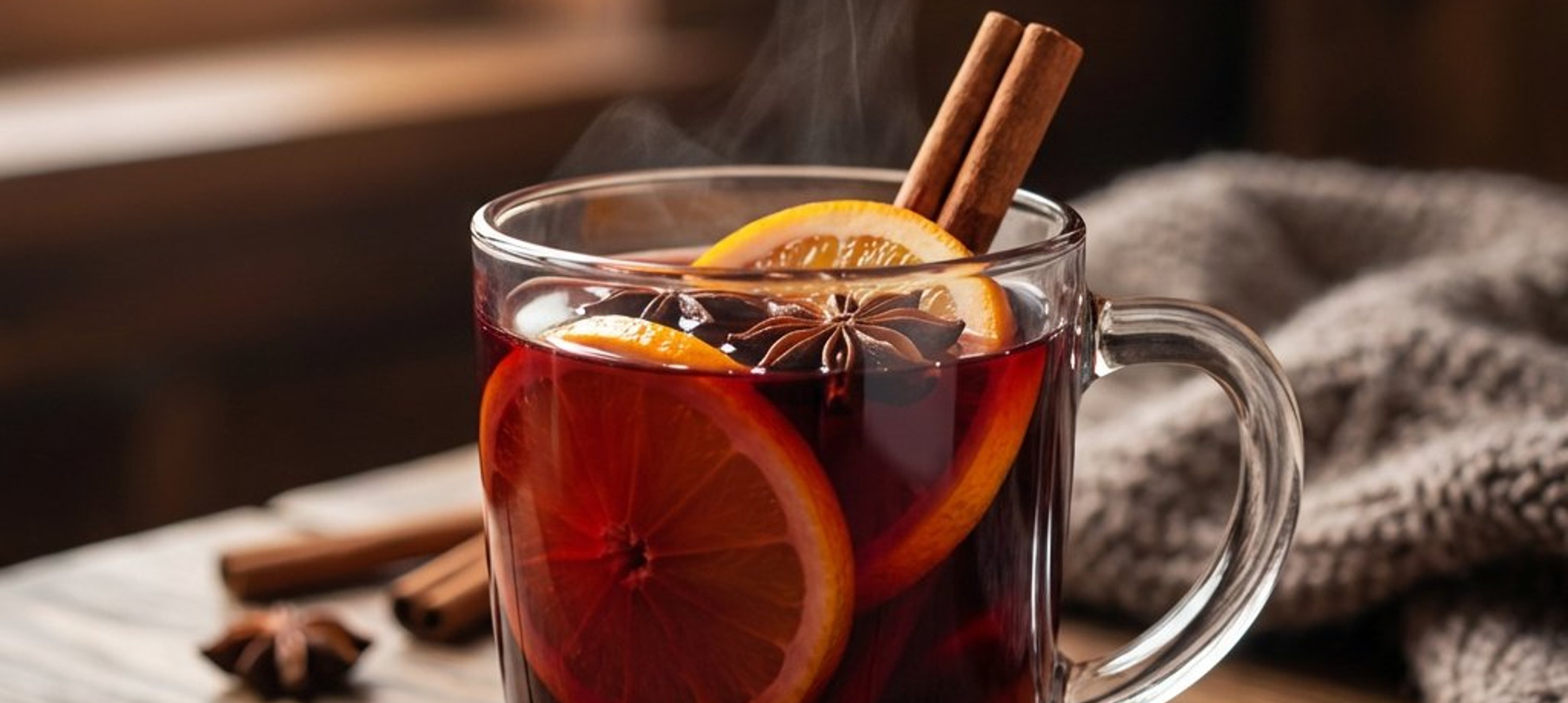 Servieren Sie den Glühwein mit einer frischen Orangenscheibe und einer Zimtstange im Glas für das perfekte Weihnachtsmarkt-Feeling zu Hause.