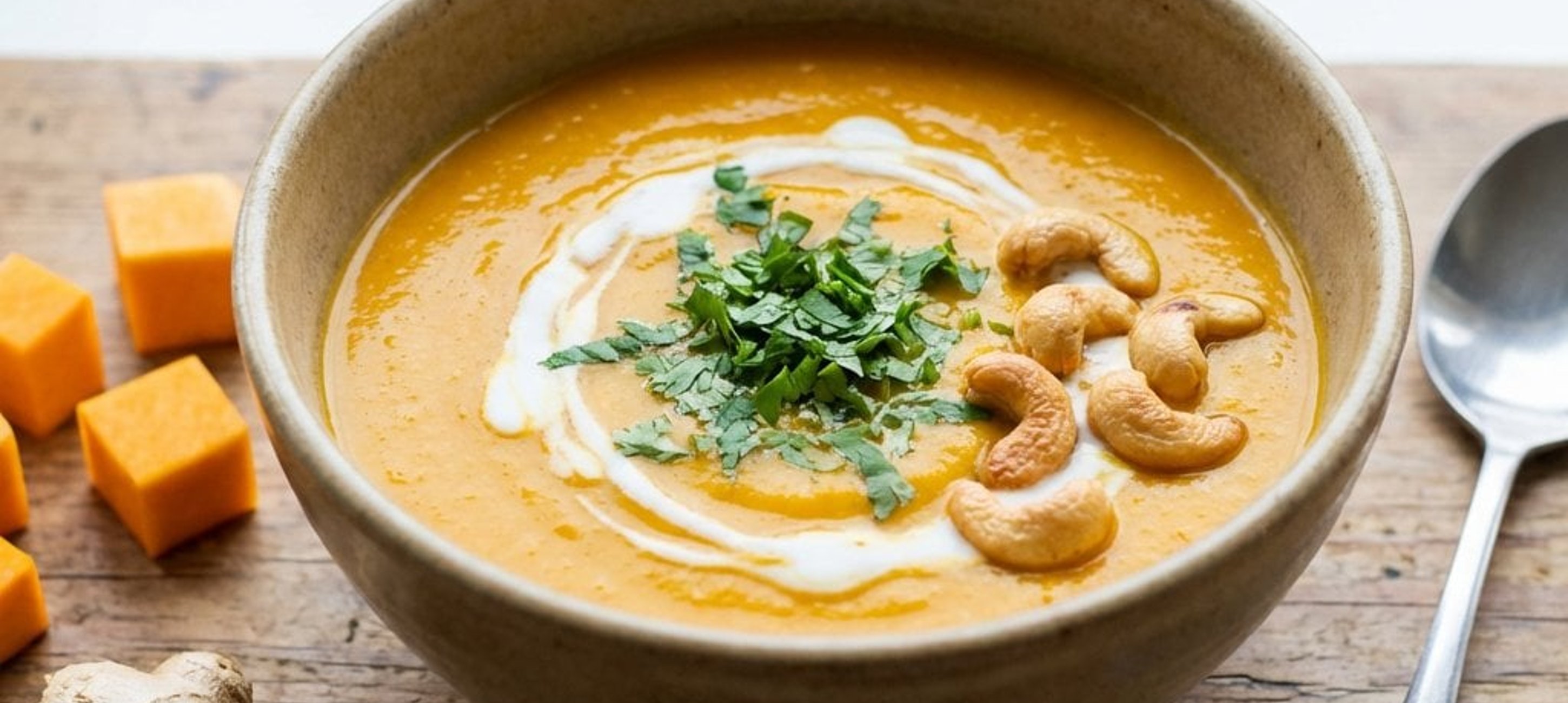 - 4Die Suppe im Topf mit einem Stabmixer fein pürieren, bis sie cremig ist. Mit Salz und Pfeffer abschmecken. Die separat gekochten Kürbiswürfel vorsichtig unterrühren. Die Suppe in Schalen anrichten, mit gehacktem Koriander und Cashewkernen bestreuen und servieren.
