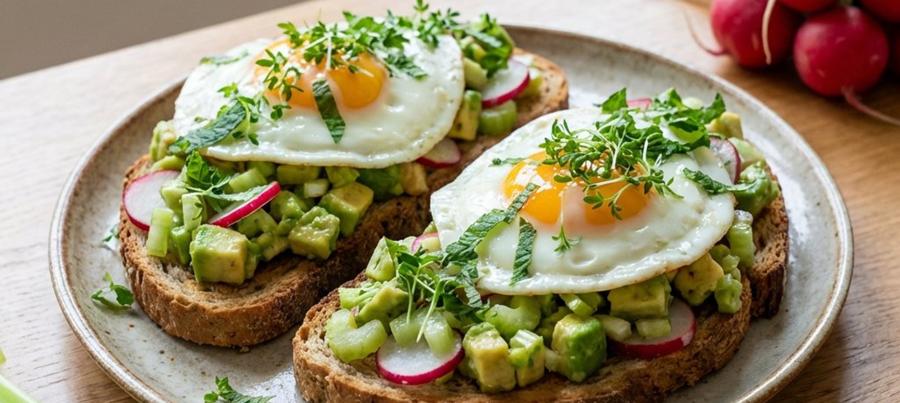 - 4Die Vollkornbrotscheiben in einer Pfanne oder im Toaster goldbraun rösten. Die Avocado-Mischung großzügig auf dem warmen Brot verteilen, das Spiegelei darauf betten und mit frischer Gartenkresse garniert servieren.