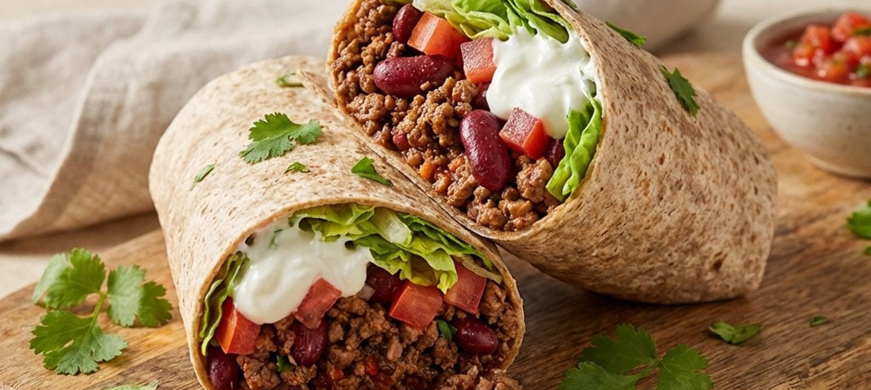 - 2Geben Sie die Fleisch-Bohnen-Mischung in die Mitte der warmen Tortilla. Schichten Sie die Tomatenwürfel, Salatstreifen, frischen Koriander und einen Klecks griechischen Joghurt darauf. Lassen Sie dabei ca. 3 cm zum Rand frei.