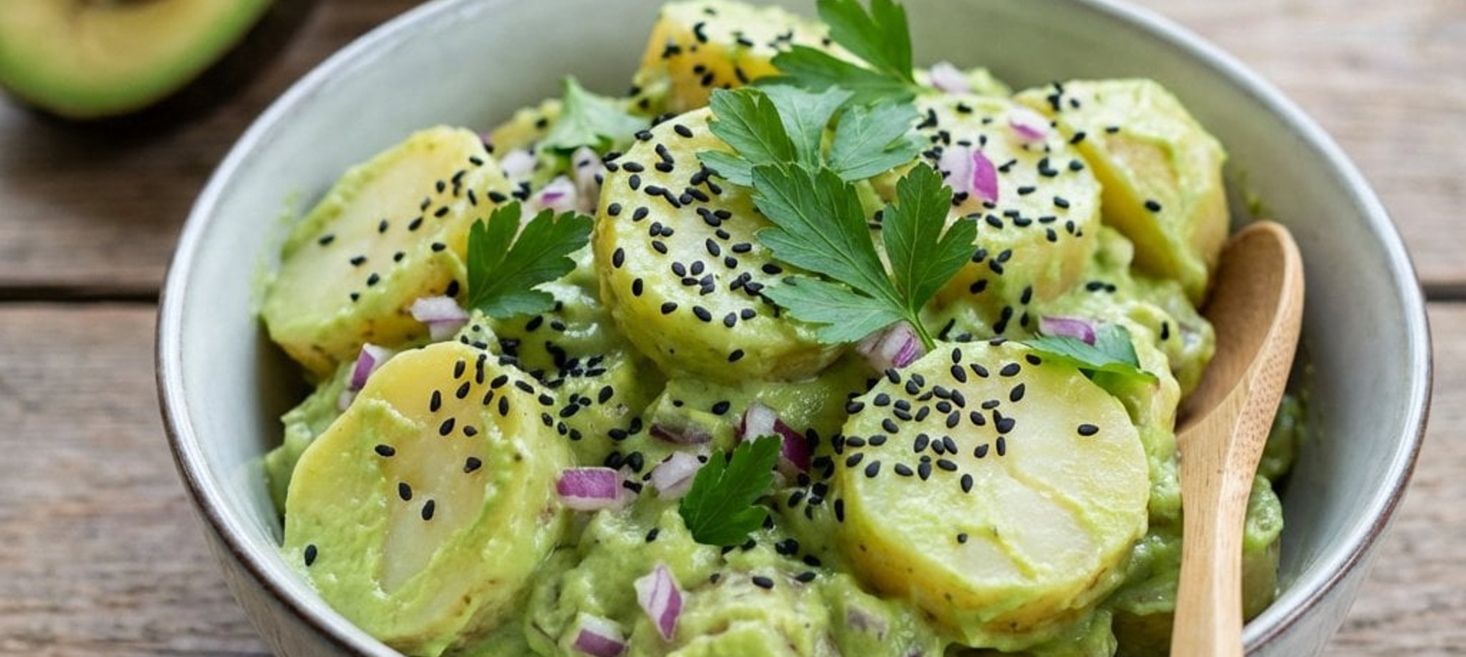 - 2Die Kartoffelscheiben, Zwiebelwürfel, gehackte Petersilie und die schwarzen Sesamsamen zum Avocado-Püree geben und alles vorsichtig, aber gründlich vermengen. Direkt servieren und genießen.