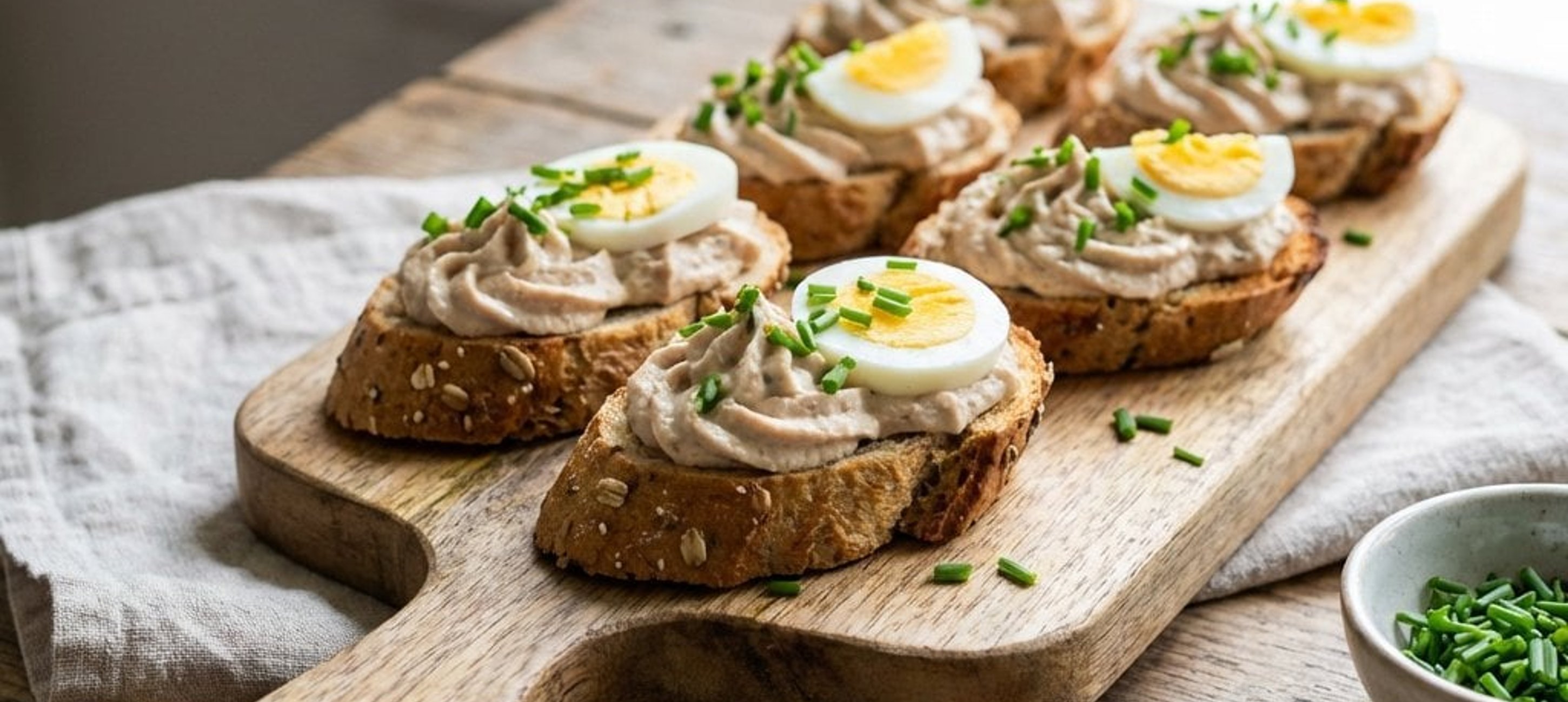- 4Das Kornbaguette in Scheiben schneiden und großzügig mit dem Thunfischaufstrich bestreichen. Die Eier pellen und in Scheiben schneiden. Jedes Canapé mit einer Eischeibe belegen und mit dem restlichen Schnittlauch garnieren.