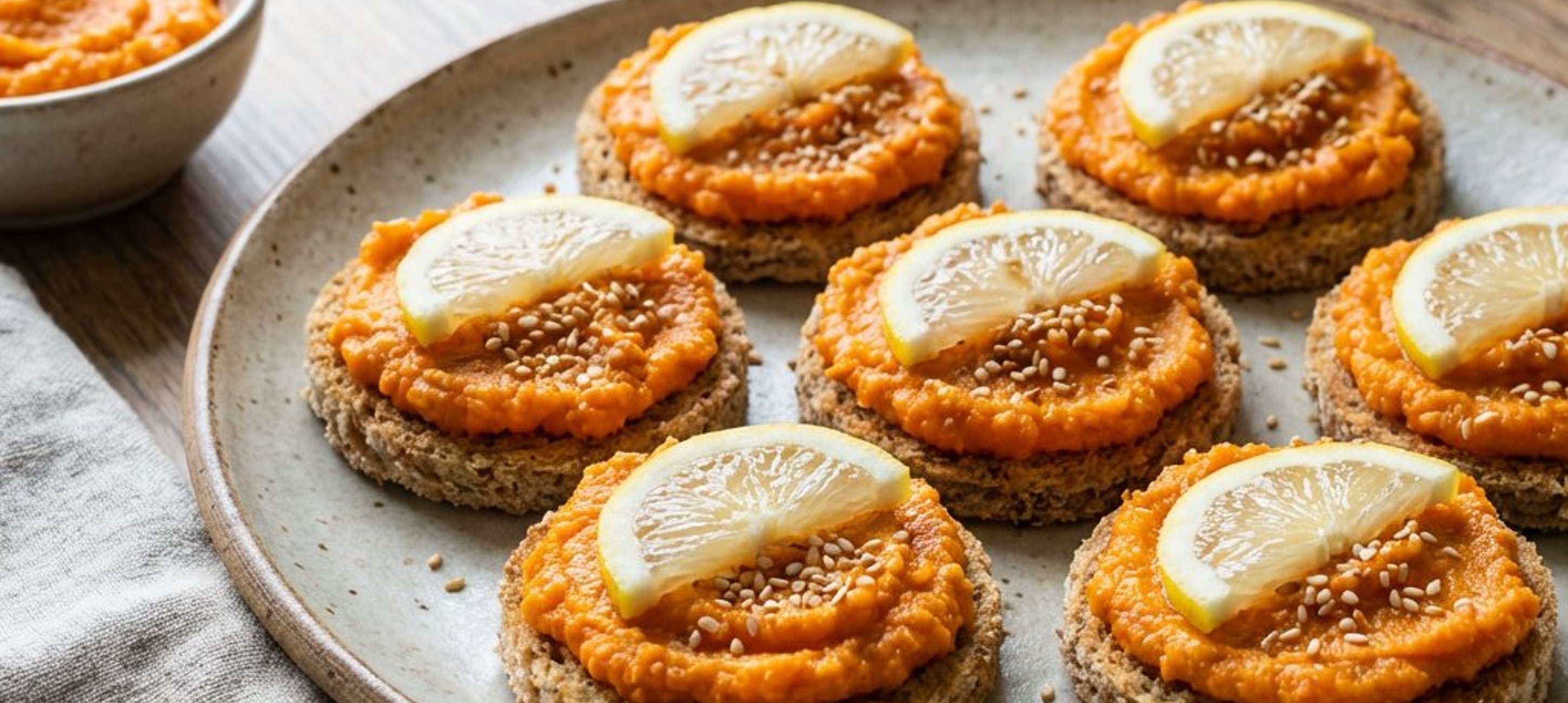 - 3Die Canapés mit Sesamsamen bestreuen und mit dünnen Zitronenscheiben (von den Bio-Zitronen) garnieren. Sofort servieren und genießen!