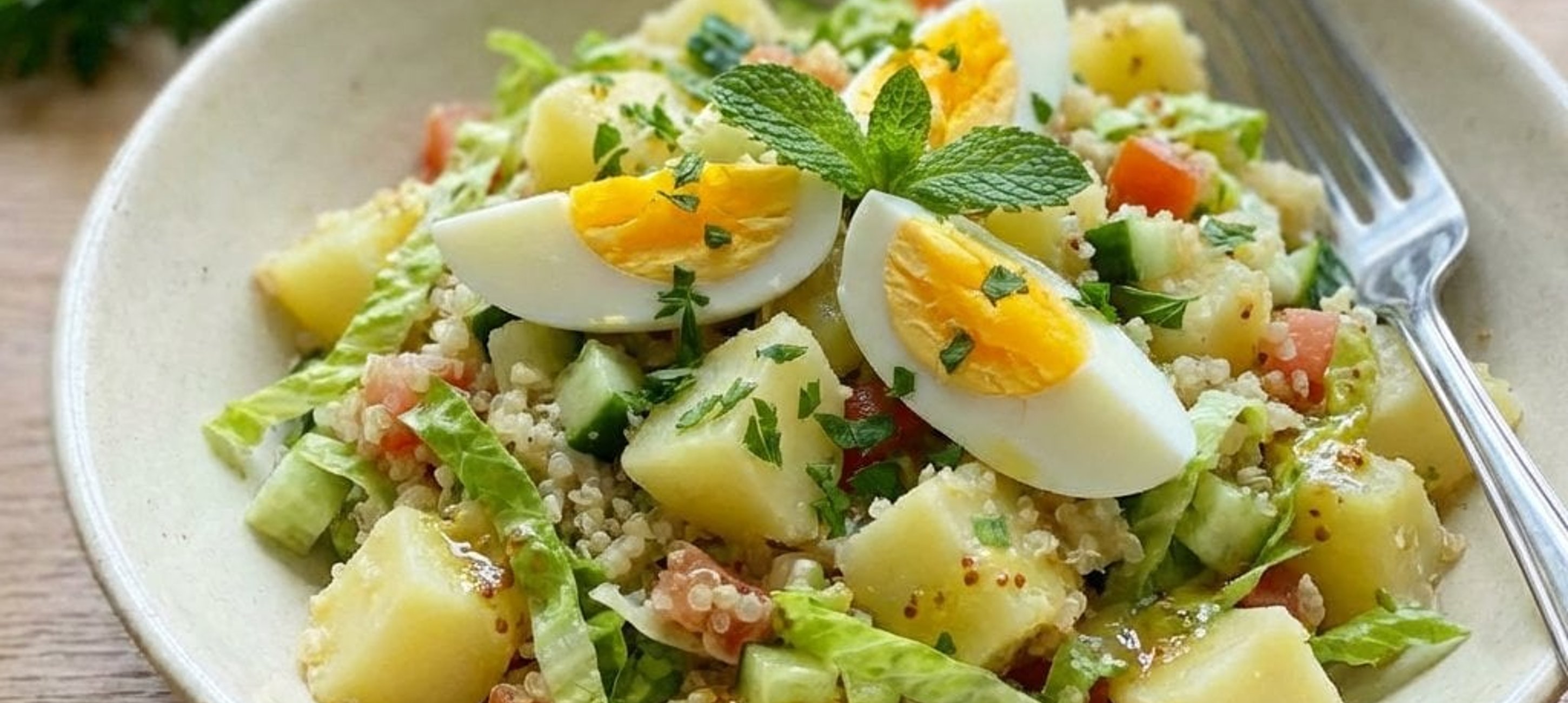 - 1In einer großen Schüssel Olivenöl, Dijonsenf, Zitronenschale und -saft sowie Salz und Pfeffer mit einem Schneebesen gründlich verquirlen. Den Römersalat in feine Streifen schneiden und in die Schüssel geben. Gurke und Tomaten in kleine Würfel schneiden und ebenfalls hinzufügen. Die geschnittenen Kartoffeln und die gekochte Quinoa unterheben und alles vorsichtig vermengen. Den Salat auf 5 Portionen verteilen, mit den Eivierteln garnieren und servieren. Nach Belieben mit frisch gehackter Petersilie und Minzblättern bestreuen.