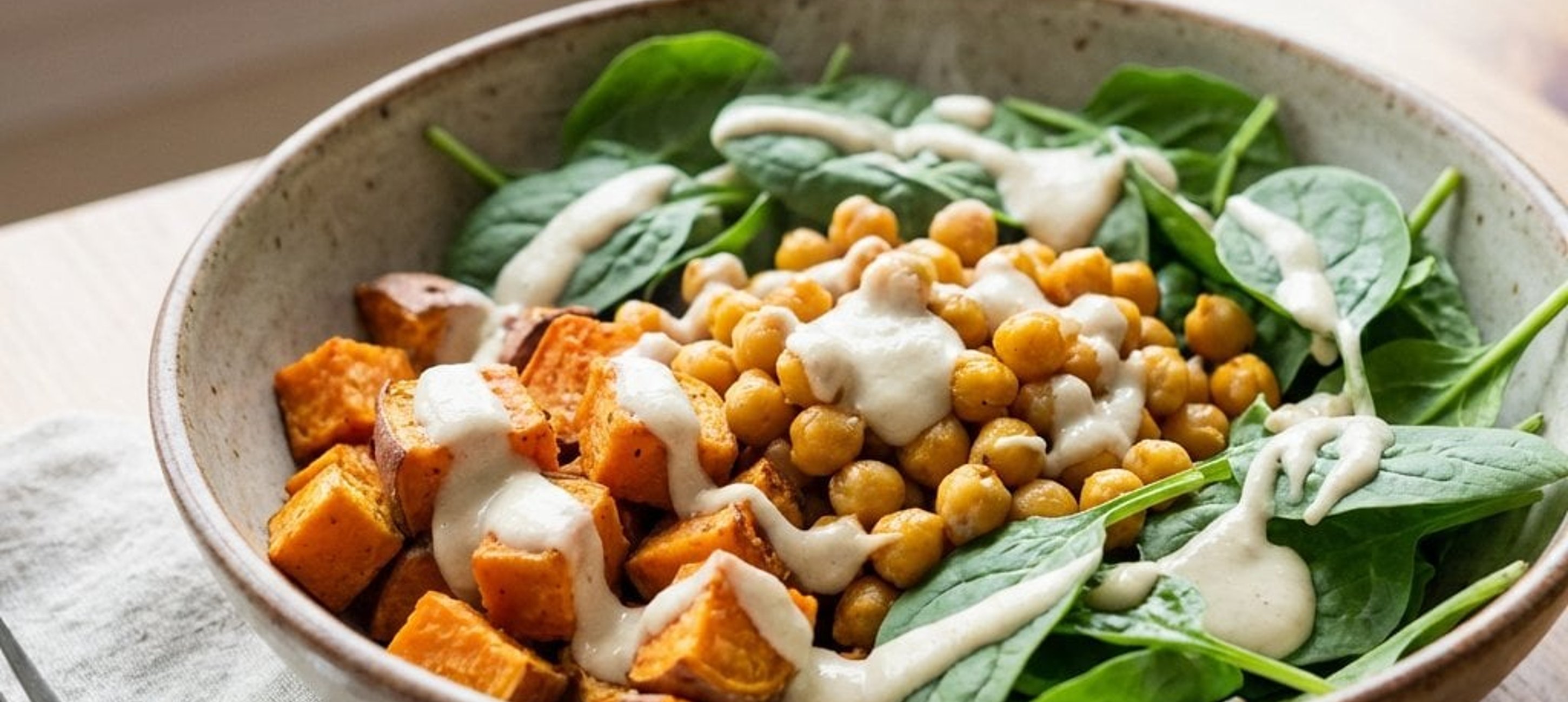 - 4Sobald die Süßkartoffeln und Kichererbsen fertig geröstet sind, das Blech aus dem Ofen nehmen. Den Babyspinat waschen, trocken schütteln und in eine große Schüssel geben. Die gerösteten Süßkartoffeln und Kichererbsen hinzufügen, mit dem Cashew-Dressing übergießen und alles vorsichtig vermengen. Auf vier Tellern anrichten und sofort servieren.