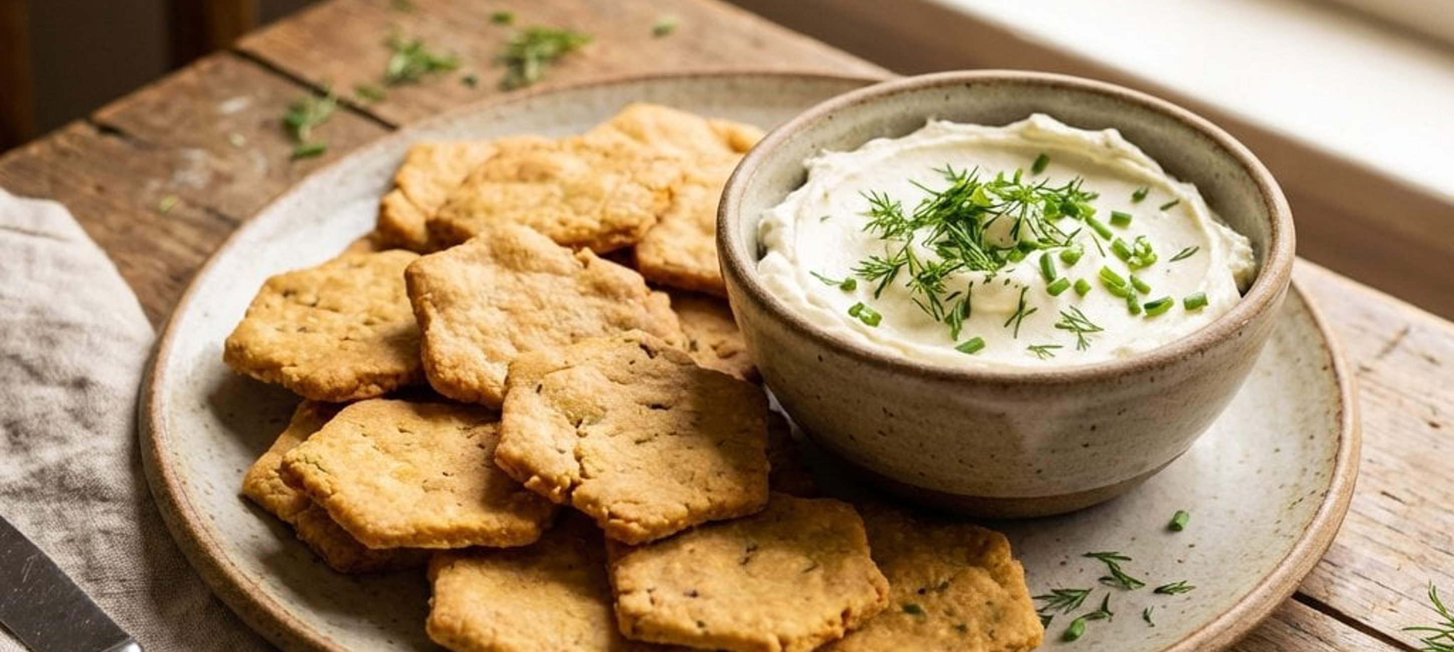 - 4Die Cracker bei 170–180 °C für 30–35 Minuten goldbraun und knusprig backen. Nach dem Backen mindestens 20 Minuten abkühlen lassen, damit sie richtig fest werden. Mit dem vorbereiteten Frischkäse servieren.