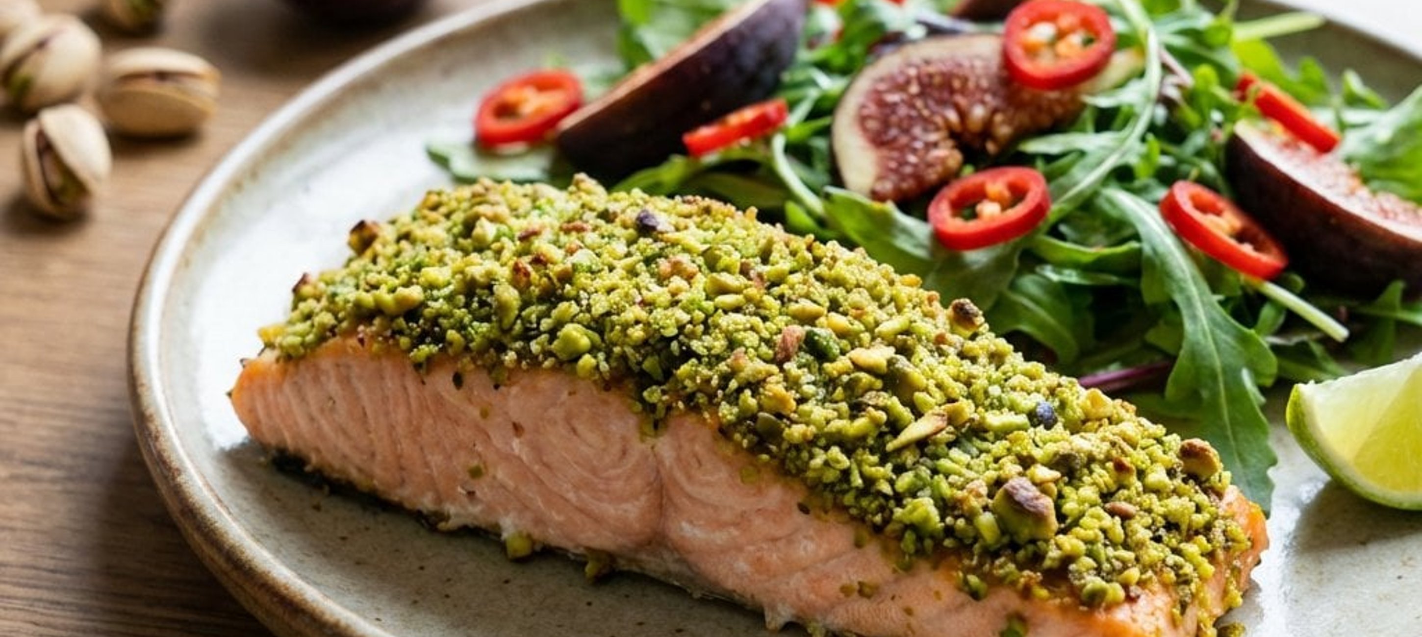 - 3In der Zwischenzeit den Salat-Mix auf Tellern anrichten. Die Feigen vierteln und darauf verteilen. Mit den restlichen Pistazien und der fein gehackten Chilischote bestreuen. Mit dem restlichen Olivenöl beträufeln und leicht salzen. Den gebackenen Lachs darauf anrichten und mit der restlichen Limette servieren. Nach Belieben am Tisch nochmals mit Salz, Pfeffer und Limettensaft abschmecken.
