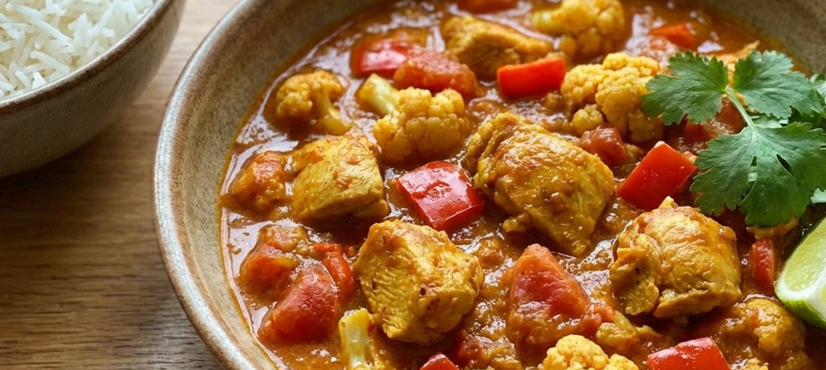 - 1In einer großen Pfanne 2 EL Olivenöl erhitzen. Das in Würfel geschnittene Hähnchenfleisch darin von allen Seiten goldbraun anbraten. Die Zwiebel hinzufügen und 2 Minuten bei mittlerer Hitze mitdünsten. Das restliche Gemüse (Blumenkohl, Tomaten, Paprika) und die Chilischote (Menge nach Belieben) hinzufügen und alles gut vermischen. Bei hoher Hitze etwa 4 Minuten braten.