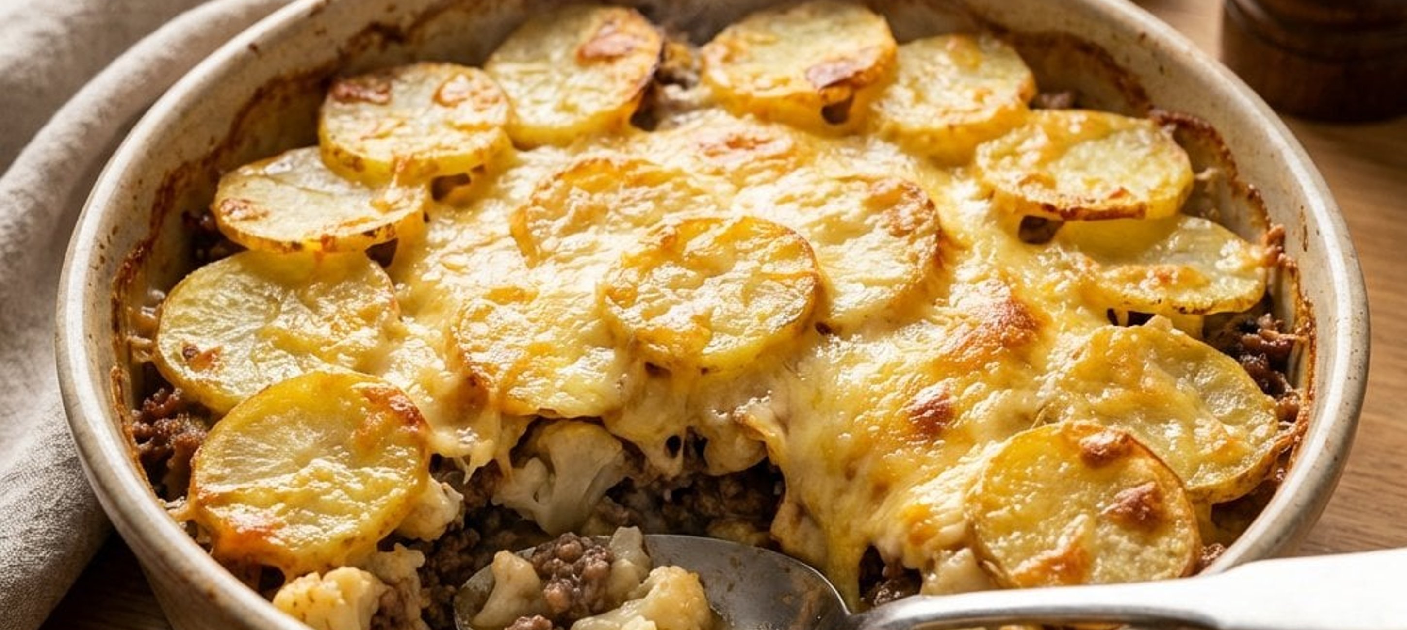 - 2Die Fleisch-Gemüse-Mischung gleichmäßig in eine Auflaufform füllen. Die vorgekochten Kartoffelscheiben dachziegelartig darauf verteilen. Den geriebenen Käse großzügig darüber streuen. Den Auflauf im vorgeheizten Ofen ca. 25-30 Minuten backen, bis der Käse goldbraun und knusprig ist.