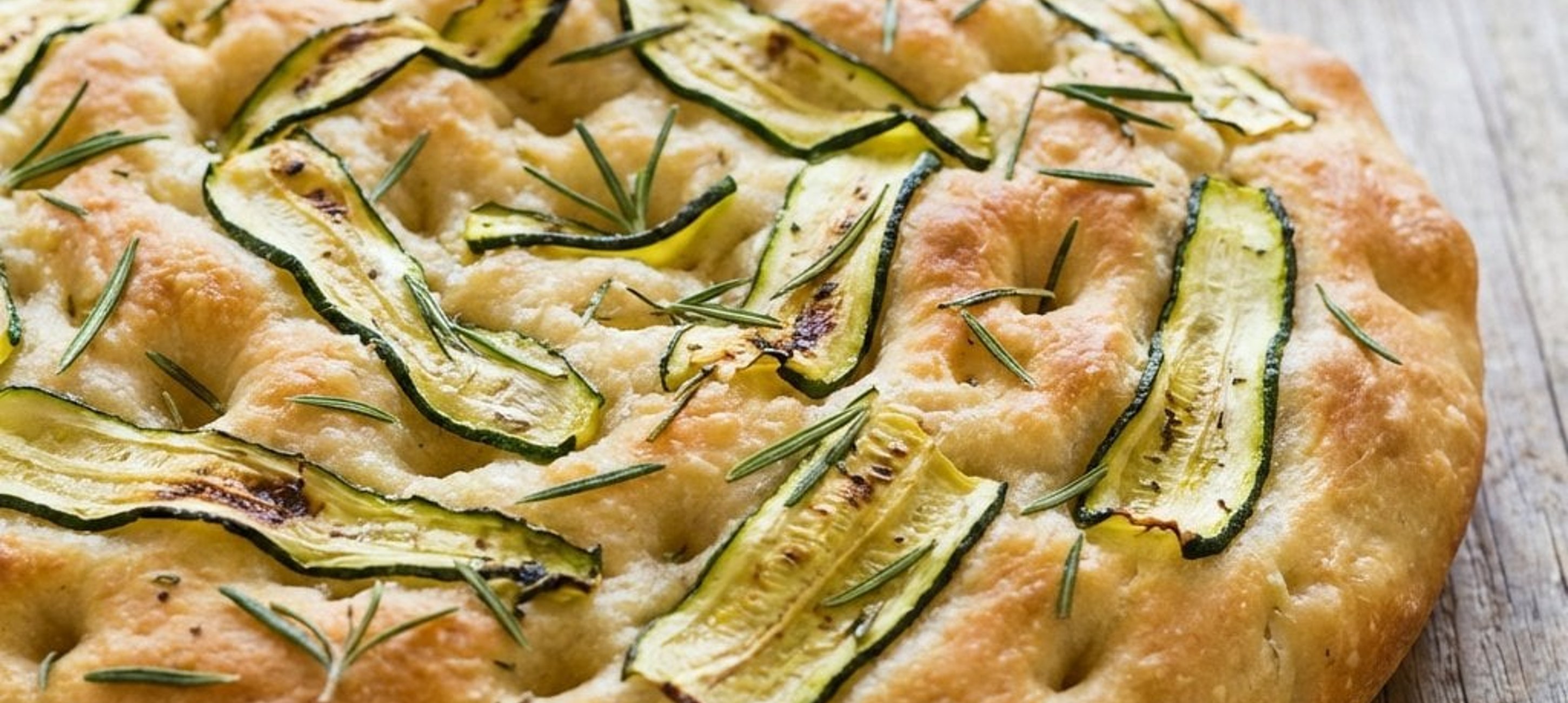 - 3Kurz vor Ende der Gehzeit den Ofen auf 180–185 °C vorheizen. Ein Backblech (ca. 30 x 40 cm) mit Backpapier auslegen. Den Teig auf das Blech geben, mit den Fingern gleichmäßig mindestens 2 cm hoch verteilen und die Zucchini-Rosmarin-Mischung darauf verteilen. Im Ofen ca. 35–40 Minuten goldbraun backen.